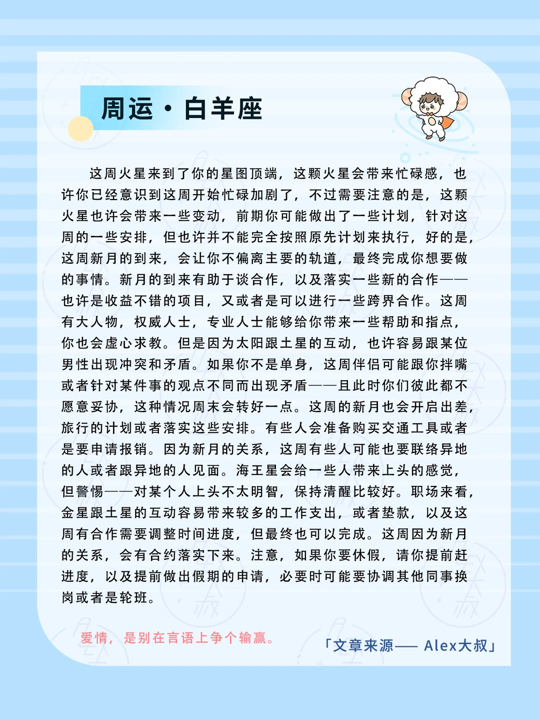 这周火星会来到新的位置,本周的星象能量会以火元素和土元素能量为主,这两股能量都会有“强势”的表现力,所以这周可能会让许多人觉得自己的情绪变得暴躁,激动,缺乏耐心,而且因为火元素强调自我,土元素强调规则,这势必也会引发一些对抗的能量,但是并非这周的星象绝对负面,相反——在这股星象能量里,也许会引发我们的深思,自省,甚至让我们终于笃定做某个思虑很久的决定。