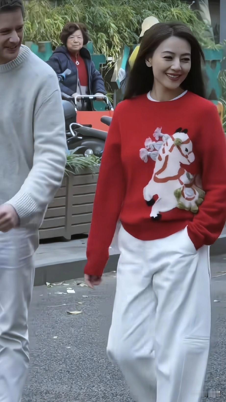 高圆圆,她穿着红色印有卡通小马的毛衣搭配白色休闲裤,笑容明媚又治愈。
