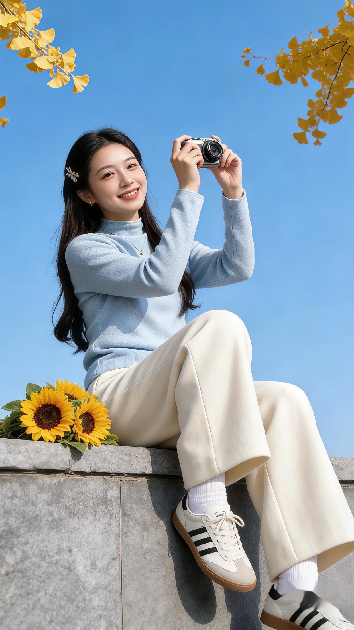浅蓝高领打底衫➕奶白阔腿裤的搭配,清清爽爽的感觉像是把蓝天穿在身上,温...