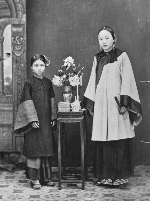 这是1876年两位宁波女性的肖像照,左侧是身着斜襟长衣的年轻女子,发髻点缀装饰,
