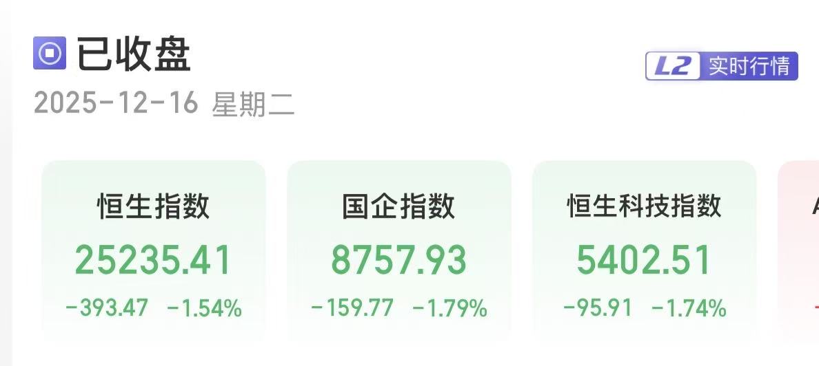 上证报中国证券网讯(刘禹希记者严晓菲)12月16日,港股三大指数承压收跌。截至收盘,恒生指数跌1.54%,报25235.41点;恒生国企指数跌1.79%,报8757.93点;恒生科技指数跌1.74%,报5402.51点。