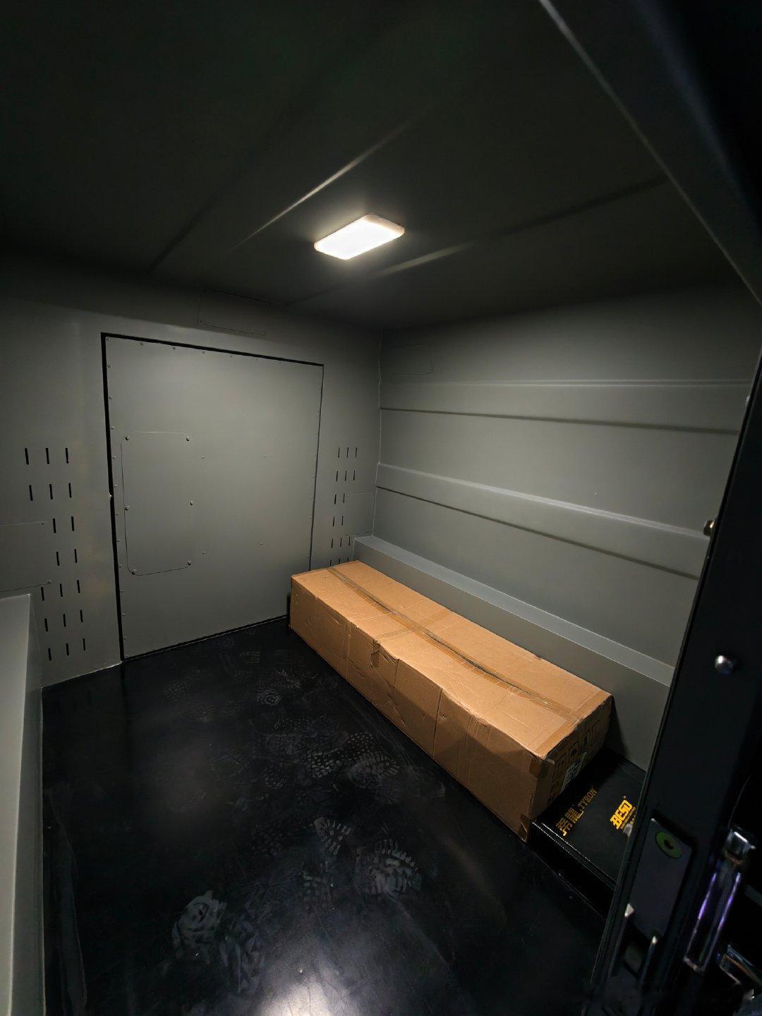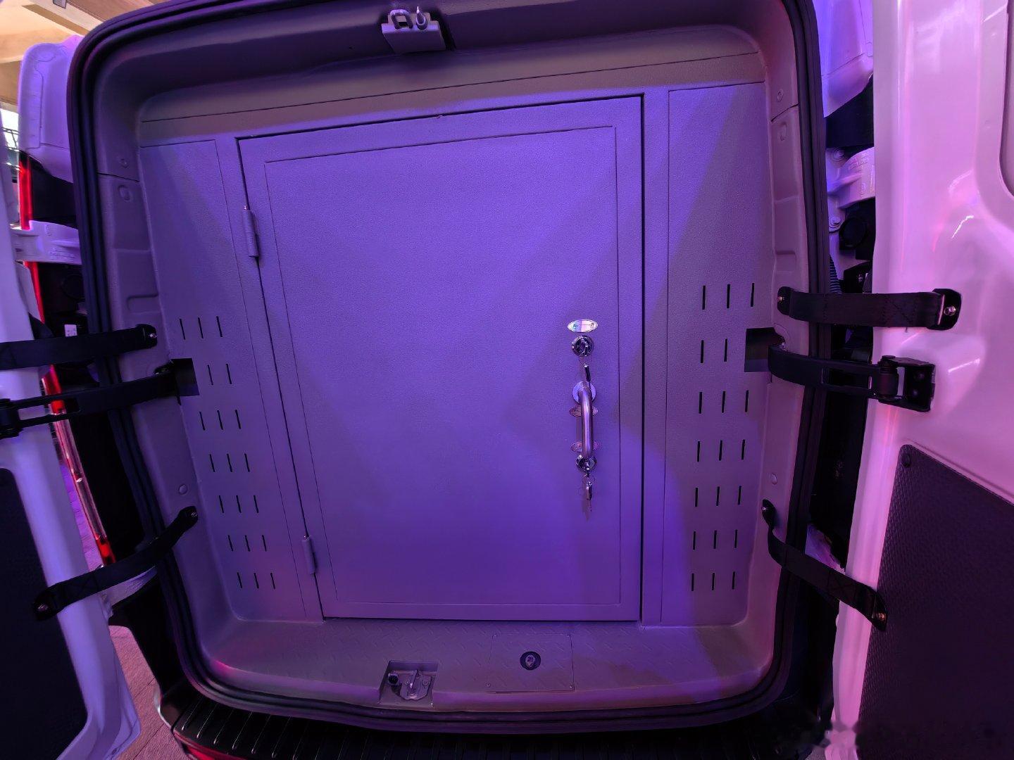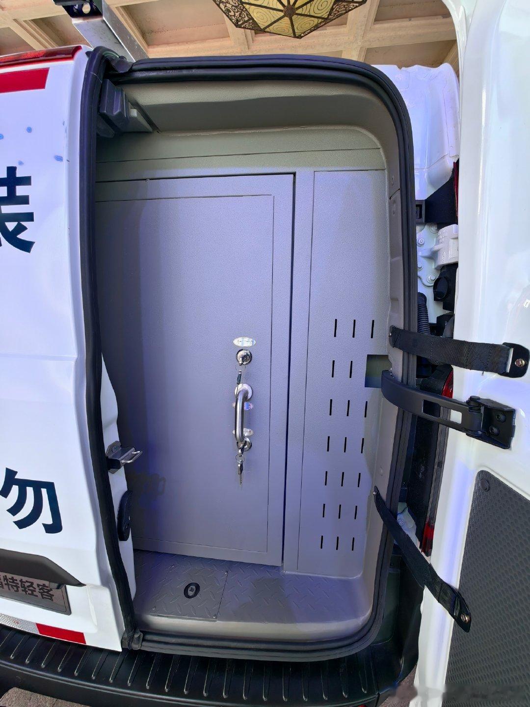又是开眼界的一天,原来生活里大家见到的银行运钞车,大多数是用江铃福特全顺特别制造出来的。因为平时都是武装押运,我们普通人很难接近看看它的构造。首先运钞车的安全级别特别高,防弹防撞就不用多说了,前后都有加强的防撞保险杠,车窗是钢化玻璃等等。两排座布局,后排头顶有个逃生窗,遇到事故车体侧翻的时候,就可以紧急逃生了。后排人员在车里面可以开锁进入保险厢体,配单个锁体。从车尾开门的话,是需要两把钥匙,开上下两个锁,再打开保险厢门。而且这个门是特制的,比家里保险柜的厚多了,也重很多很多。车厢四周以及车厢里都布置很多摄像头,各种监控设备、对讲机一应俱全。不懂就问,后门打开,地板上还留了一个给特制工具开锁的孔,那个地方是干啥用的?有知道的朋友吗?倨能聊大V聊车