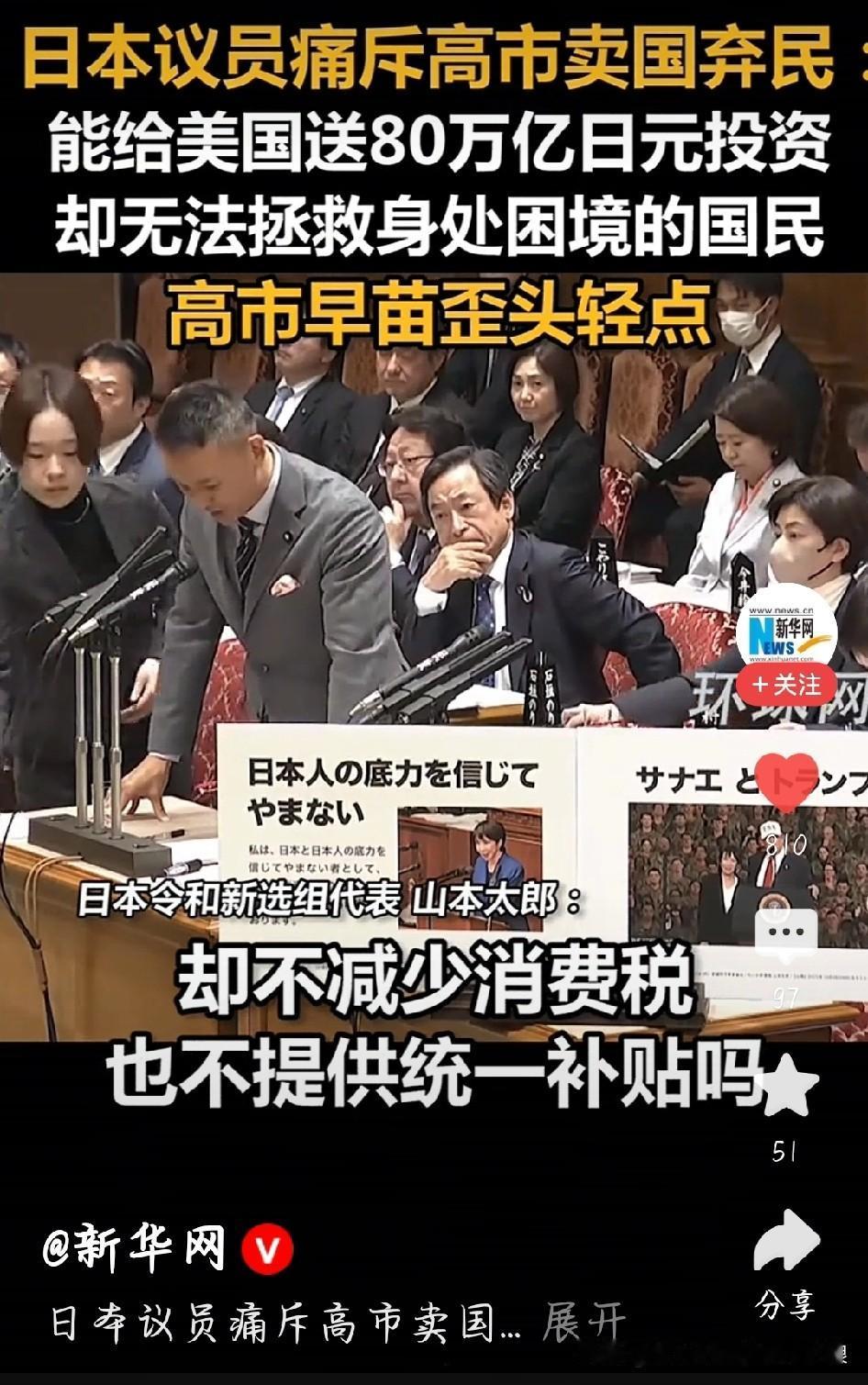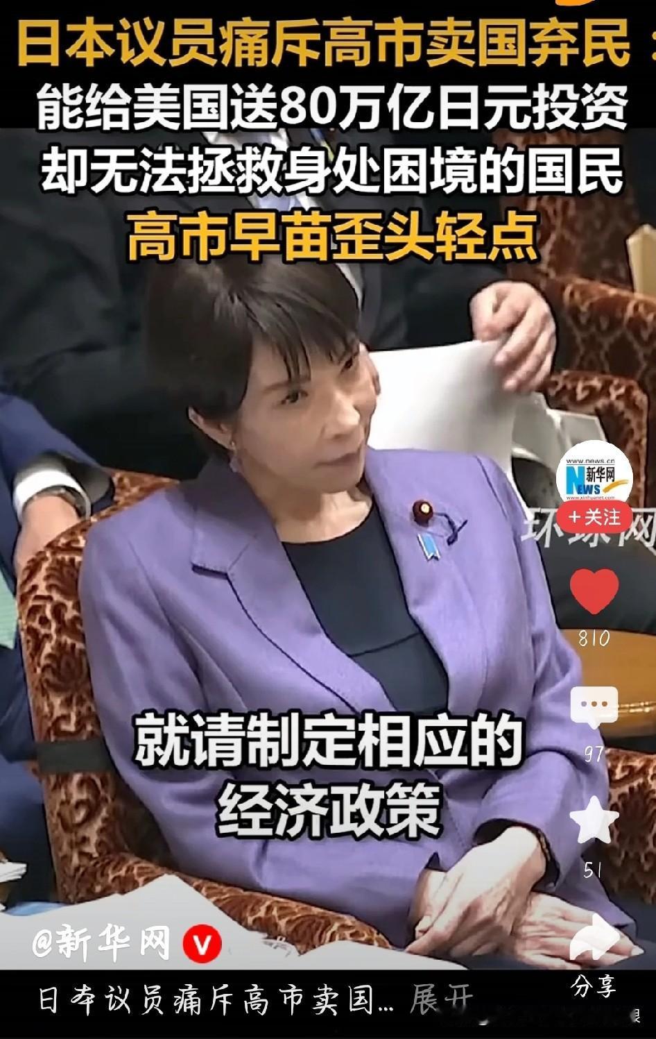 太解气!高市早苗国会遭痛斥“卖国弃民” 刷到日本国会的新闻,真是大快人心!首相高市早苗直接被议员当众骂“卖国弃民”,一点情面没留。 她倒好,不管日本老百姓日子多苦,物价飞涨工资不涨,非要拿80万亿日元给美国投资,90%利润都流到美国,国内民生不管不顾。还瞎掺和台海问题,说“台湾有事就是日本有事”,想跟着美国挑事。 拿着民众的钱讨好美国,还想把日本往战争里带,难怪被痛批。日本民众都上街抗议了,要求她撤回谬论。这种不管本国百姓、只顾对外挑事的政客,迟早被大家唾弃!高市早苗国会现场遭痛斥:卖国弃民 高市早苗遭痛斥卖国弃民 日本政坛乱象 图片截图于网络