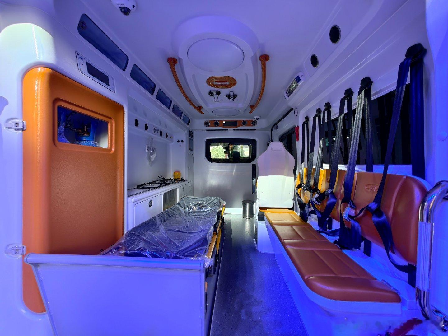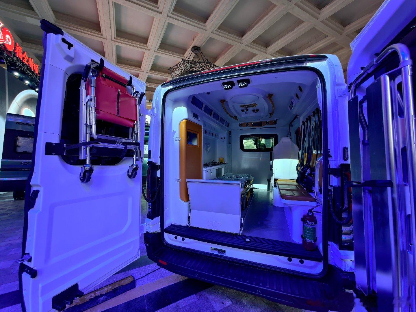 江铃福特造救护车也特别专业,这是一台由全顺T8中轴改的救护车,用于各大医院、省市急救中心等卫生服务和保障机构。它采用第四代全新江铃全顺做为基础底盘,搭载第五代福特PUMA 2.3T发动机。救护车特别讲究高刚度和安全性能,它车身高强钢占比65%,全车用了68处航母级硼钢。我也是第一次参观救护车,它搭载了车载担架、集中供氧系统、ABS一体成型医疗橱柜等。听说未来还会改装升级手术台,对紧急救助进一步提升效率。倨能聊大V聊车