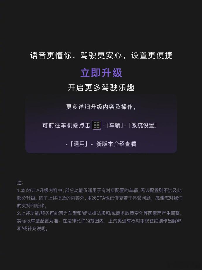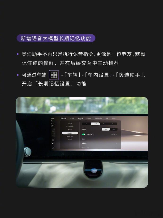 奥迪E5 Sportback的首次OTA升级,已经在车友圈里刷了一波存在感!这次更新到AUDI OS 1.1.0,重点优化了四个方向,加了十多项新功能,还把两百多处体验细节都调整得更舒服。其中最有意思的是奥迪助手的新变化:有了「长期记忆」,会慢慢记着车主的用车习惯;还有35种互动动画,过节会有软乎乎的专属问候,长途看电影时会跟着剧情变样子,连车内味道变了,它的视觉形象都会跟着调整,哪里是智能系统,明明是个会感知的小伙伴!而且之后还会有新的OTA,会加车辆状态提醒、优化辅助驾驶,能感觉出来,是真的把大家用车的小需求放在心上了,你喜欢更新以后的体验吗?我的车今天好像有情绪了AUDI迎来大规模OTA大v聊车