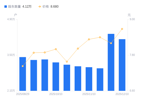 日期A股户数(户)流通A股户均持股数(股)户均持股市值(万元)2025-12-10412487840.166.812025-11-28433347462.756.122025-11-202981910845.139.112025-11-103025310689.558.902025-10-313063110557.638.472025-10-203124110351.497.852025-10-103215210058.198.052025-09-30333129707.947.662025-09-10331079768.057.702025-08-29342229449.797.02