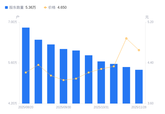日期A股户数(户)流通A股户均持股数(股)户均持股市值(万元)2025-12-105251213623.146.042025-11-285359913346.866.212025-11-205457013109.376.402025-11-105564812855.425.572025-10-315649712662.235.422025-10-205859712208.445.142025-10-106023711876.064.862025-09-306075411775.004.782025-09-196232011479.114.762025-09-106395011186.524.88