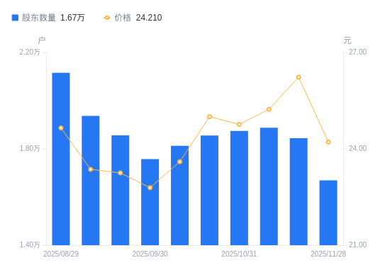 近一年(2024年11月29日至2025年11月28日),博亚精工A股股东户数从1.19万户,增加至1.67万户,增幅40.42%,区间股价上涨55.76%。