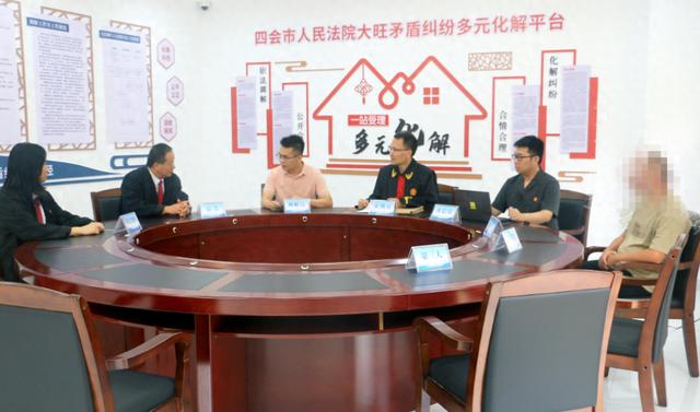 法官陈智和四会市政协委员邓国盛与当事人进行调解。