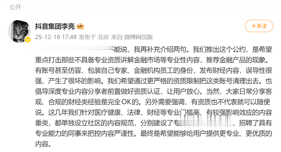 12月16日,抖音集团副总裁李亮发文称,抖音推出财经行业治理公约,是希望重点打击那些不具备专业资质讲解金融市场等专业性内容,推荐金融产品的现象。日常分享客观、合规的财经类经验是完全OK的。另外需要强调,有资质也不代表就可以随便说。