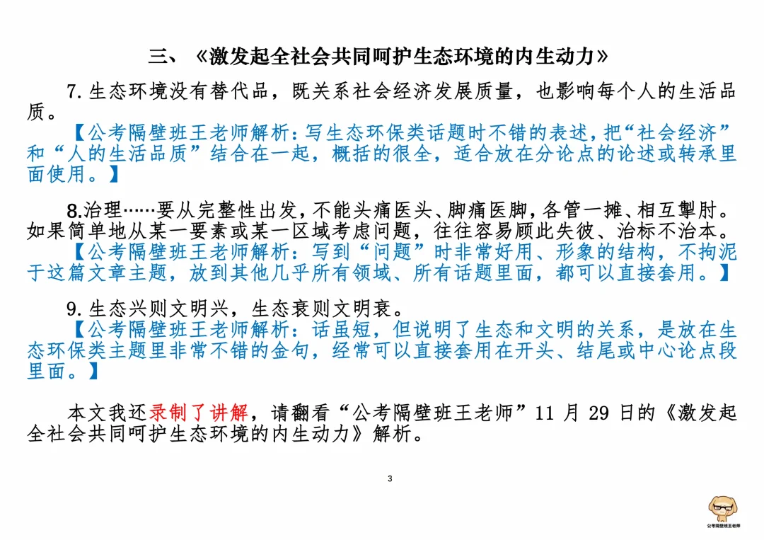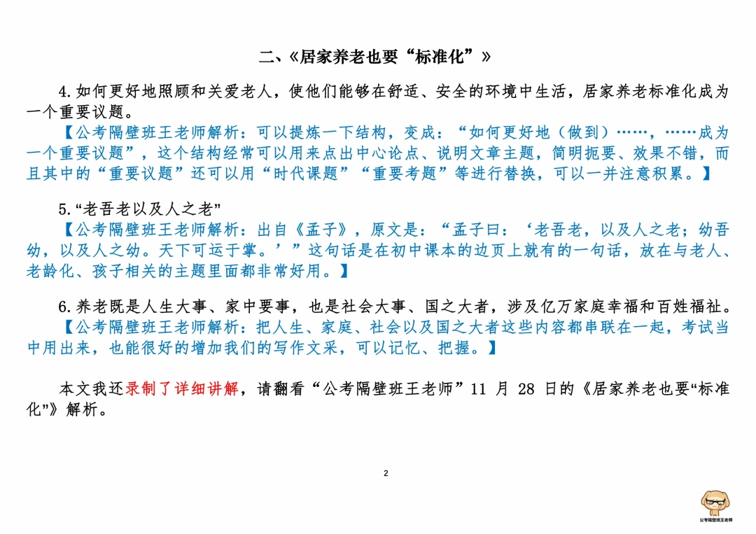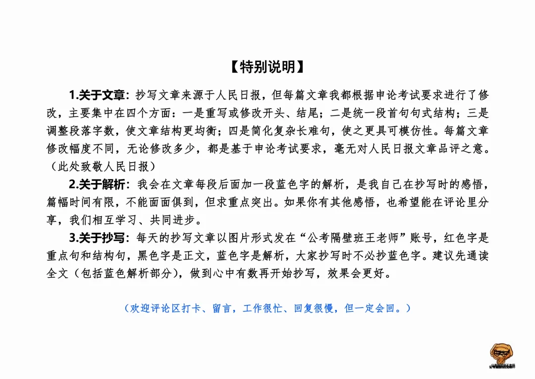 今天我们积累申论素材、必背金句和重点知识。它们来自于一周以来,我们学习的4篇人民日报申论范文,分别是: 1. 《在乡村振兴实践中砥砺成长》(11.27,周一) 2. 《居家养老也要“标准化”》(11.28,周二) 3. 《激发起全社会共同呵护生态环境的内生动力》(11.29,周三) 4. 《用实干推动发展、取信于民》(11.30,周四) 每篇文章的详细讲解请回顾本周视频。 ⭐ ⭐ ⭐ ⭐ ⭐ ⭐ 这里是公考隔壁班王老师独创的“每天半小时・申论80分”抄写团,欢迎加入我们!
