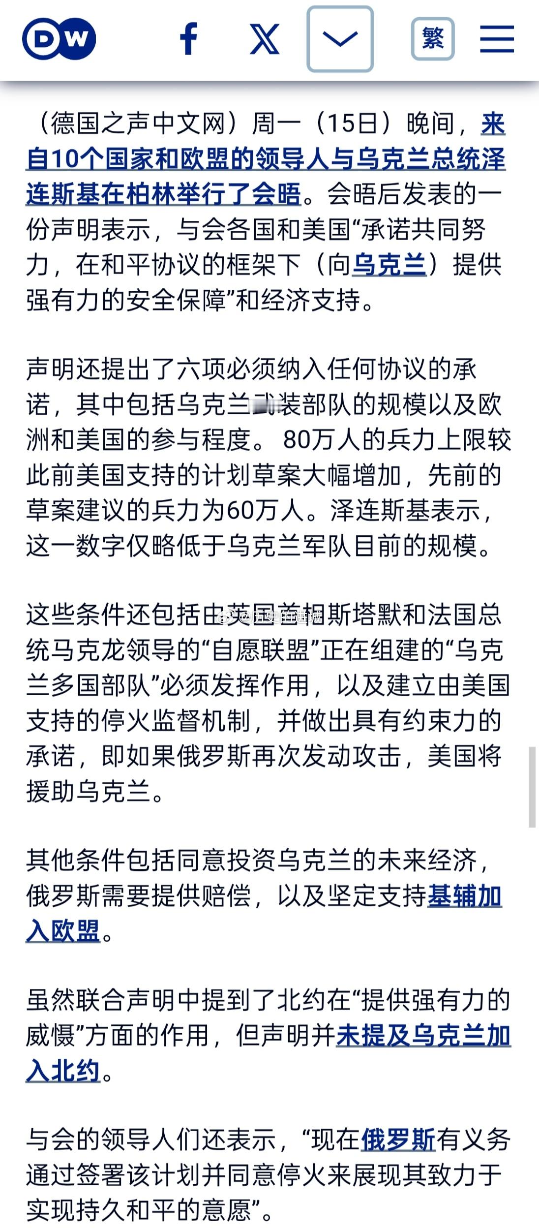 周一(15日)晚间,来自10个国家和欧盟的领导人与乌克兰总统泽连斯基在柏林举行了会晤。会晤后发表的一份声明表示,与会各国和美国“承诺共同努力,在和平协议的框架下(向乌克兰)提供强有力的安全保障”和经济支持。声明还提出了六项必须纳入任何协议的承诺,其中包括乌克兰武装部队的规模以及欧洲和美国的参与程度。 80万人的兵力上限较此前美国支持的计划草案大幅增加,先前的草案建议的兵力为60万人。泽连斯基表示,这一数字仅略低于乌克兰军队目前的规模。这些条件还包括由英国首相斯塔默和法国总统马克龙领导的“自愿联盟”正在组建的“乌克兰多国部队”必须发挥作用,以及建立由美国支持的停火监督机制,并做出具有约束力的承诺,即如果俄罗斯再次发动攻击,美国将援助乌克兰。其他条件包括同意投资乌克兰的未来经济,俄罗斯需要提供赔偿,以及坚定支持基辅加入欧盟。虽然联合声明中提到了北约在“提供强有力的威慑”方面的作用,但声明并未提及乌克兰加入北约。