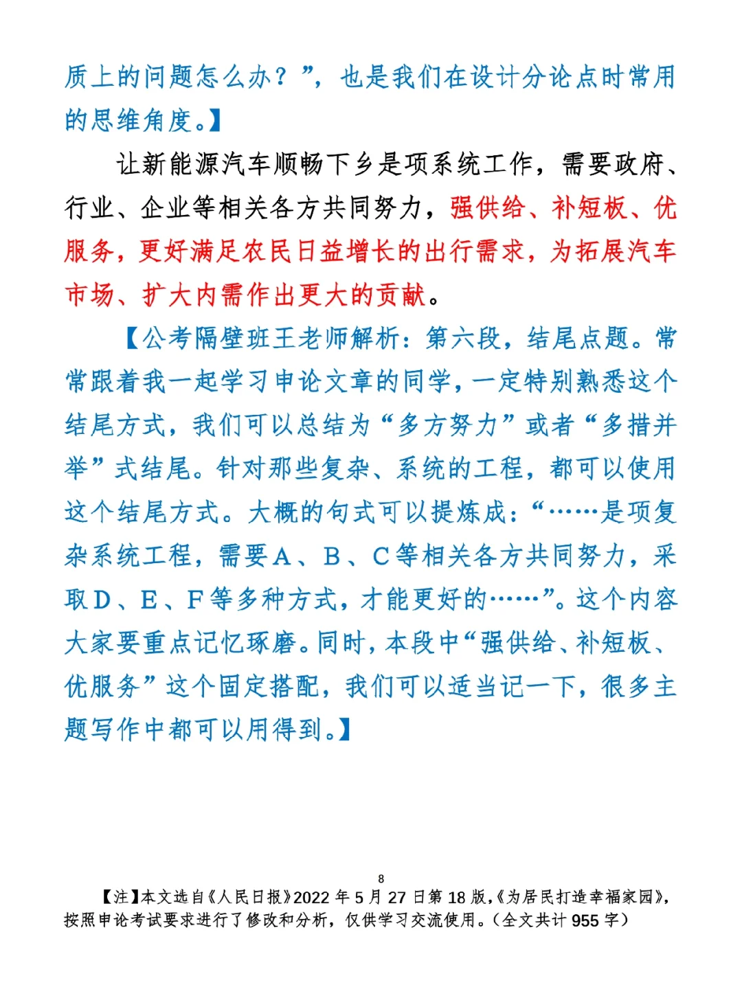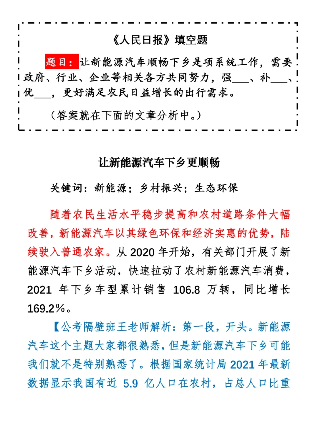 今日打卡作业: 1. 完成填空题 2. 抄写全文红字+划线部分内容 3. 写完后在留言区打卡 ⭐️ ⭐️ ⭐️ ⭐️ ⭐️ ⭐️ 如何抄写:每天的抄写文章以图片形式发在“公考隔壁班王老师”账号,红色字是重点句和结构句,黑色字是正文,蓝色字是解析,大家抄写时不必抄蓝色字。建议先通读全文(包括蓝色解析部分),做到心中有数再开始抄写,效果会更好。 关于文章:抄写文章来源于人民日报,但每篇文章我都根据申论考试要求进行了修改,主要集中在四个方面:一是重写或修改开头、结尾;二是统一段首句句式结构;三是调整段落字数,使文章结构更均衡;四是简化复杂长难句,使之更具可模仿性。每篇文章修改幅度不同,无论修改多少,都是基于申论考试要求,毫无对人民日报文章品评之意。(此处致敬人民日报) 关于解析:我会在文章每段后面加一段蓝色字的解析,是我自己在抄写时的感悟,篇幅时间有限,不能面面俱到,但求重点突出。如果你有其他感悟,也希望能在评论里分享,我们相互学习、共同进步。 ⭐️ ⭐️ ⭐️ ⭐️ ⭐️ ⭐️ 这里是公考隔壁班王老师独创的“每天半小时・申论80分”抄写团,欢迎加入我们!