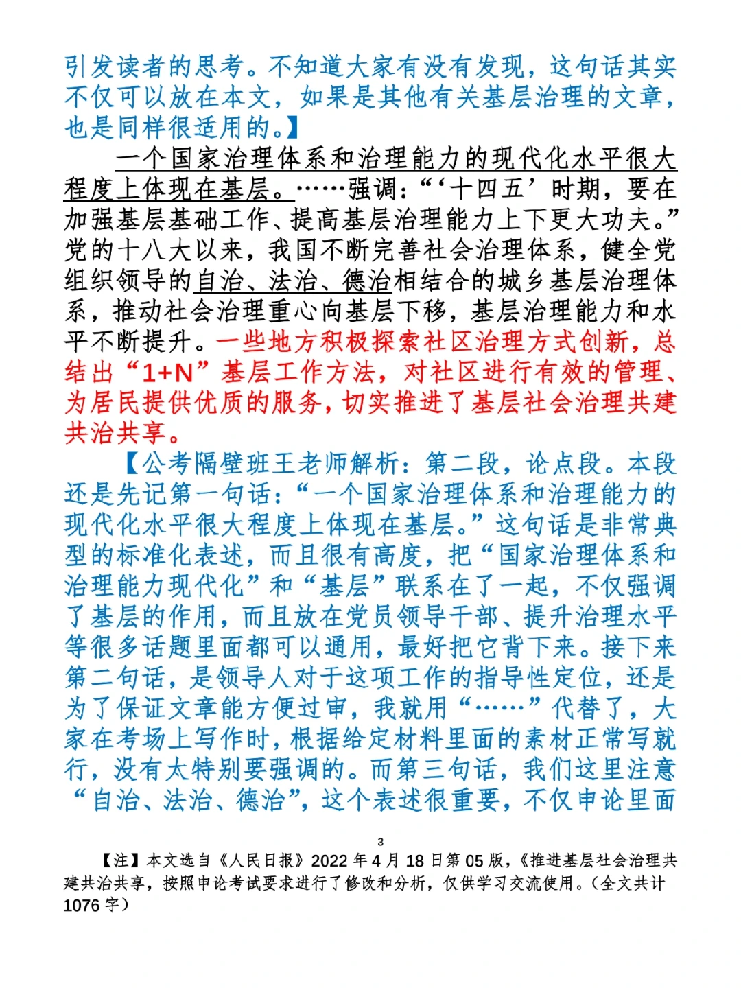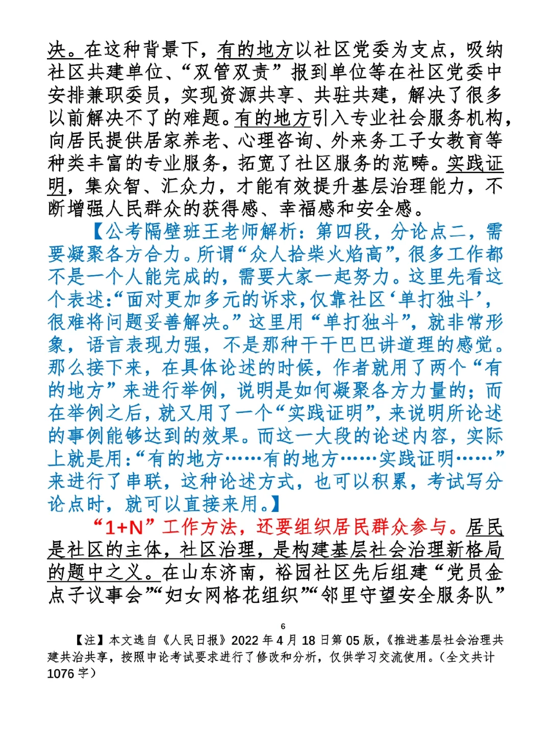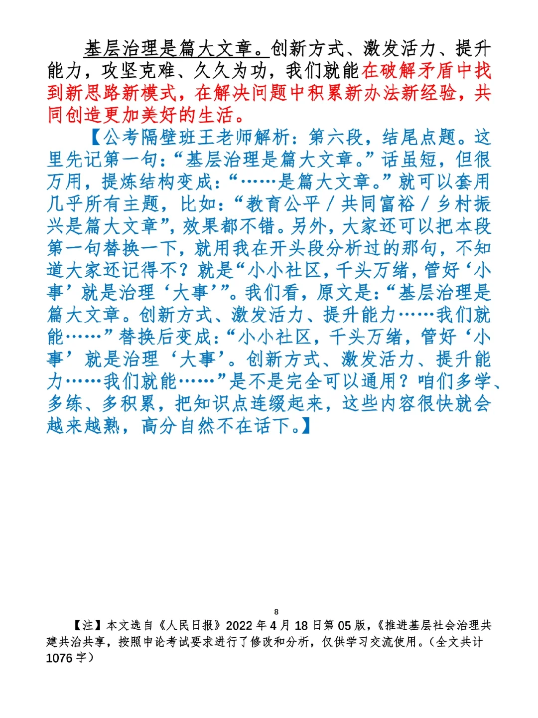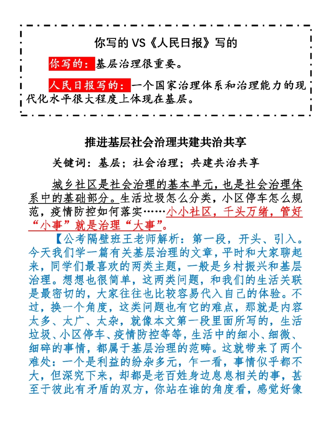 1.如何抄写:每天的抄写文章以图片形式发在“公考隔壁班王老师”账号,红色字是重点句和结构句,黑色字是正文,蓝色字是解析,大家抄写时不必抄蓝色字。建议先通读全文(包括蓝色解析部分),做到心中有数再开始抄写,效果会更好。 2.关于文章:抄写文章来源于人民日报,但每篇文章我都根据申论考试要求进行了修改,主要集中在四个方面:一是重写或修改开头、结尾;二是统一段首句句式结构;三是调整段落字数,使文章结构更均衡;四是简化复杂长难句,使之更具可模仿性。每篇文章修改幅度不同,无论修改多少,都是基于申论考试要求,毫无对人民日报文章品评之意。(此处致敬人民日报) 3.关于解析:我会在文章每段后面加一段蓝色字的解析,是我自己在抄写时的感悟,篇幅时间有限,不能面面俱到,但求重点突出。如果你有其他感悟,也希望能在评论里分享,我们相互学习、共同进步。 ⭐️ ⭐️ ⭐️ ⭐️ ⭐️ ⭐️ 这里是公考隔壁班王老师独创的“每天半小时 申论80分”抄写团,欢迎加入我们!