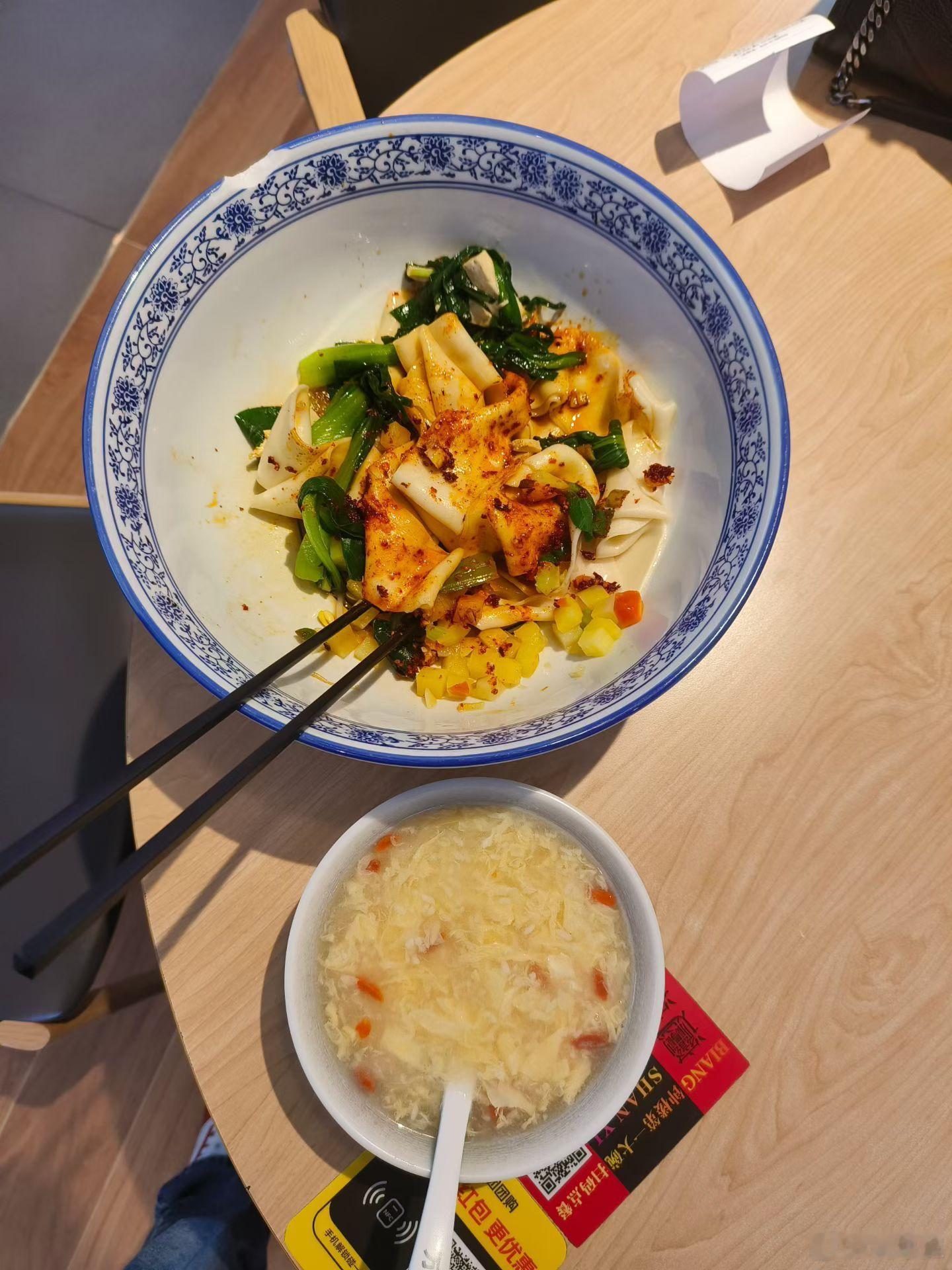 西安钟楼骡马市大街的油泼裤带面真好吃✌🏻每日一餐分享 旁边的是酒醪糟蛋花汤,那