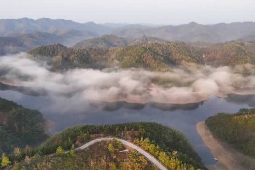 12月15日清晨,祁东县红旗水库,蒸腾的云雾与青山湖水交相辉映,蜿蜒公路点缀其间,构成一幅如诗的山水画卷。