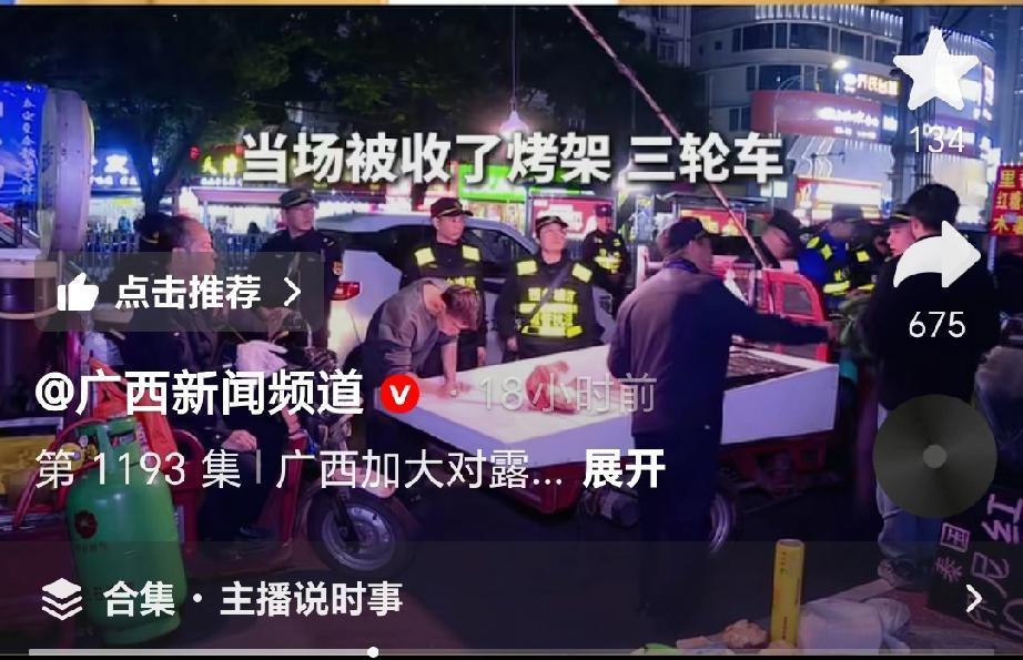 12月以来广西加大对露天烧烤占道炒卖的整治力度,15日南宁公布了5起典型案例,涉及康岭花城、大学西路等地。这些地方的摊主因占道经营、油烟呛人,被当场没收烤架、三轮车,还有人被罚款500元。这些摊点不仅油烟熏得周边居民不满,还占道影响交通。此次城管铁腕出手整治,被认为是实实在在为民办事。新闻强调城市“烟火气”不能以牺牲环境为代价,规范经营才是长久之道,同时也期盼能有长效监管守住这份清爽。(来源于@广西新闻频道 )