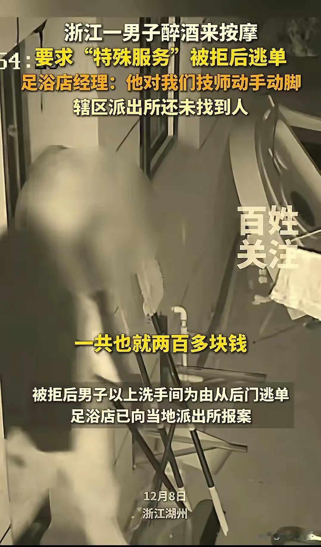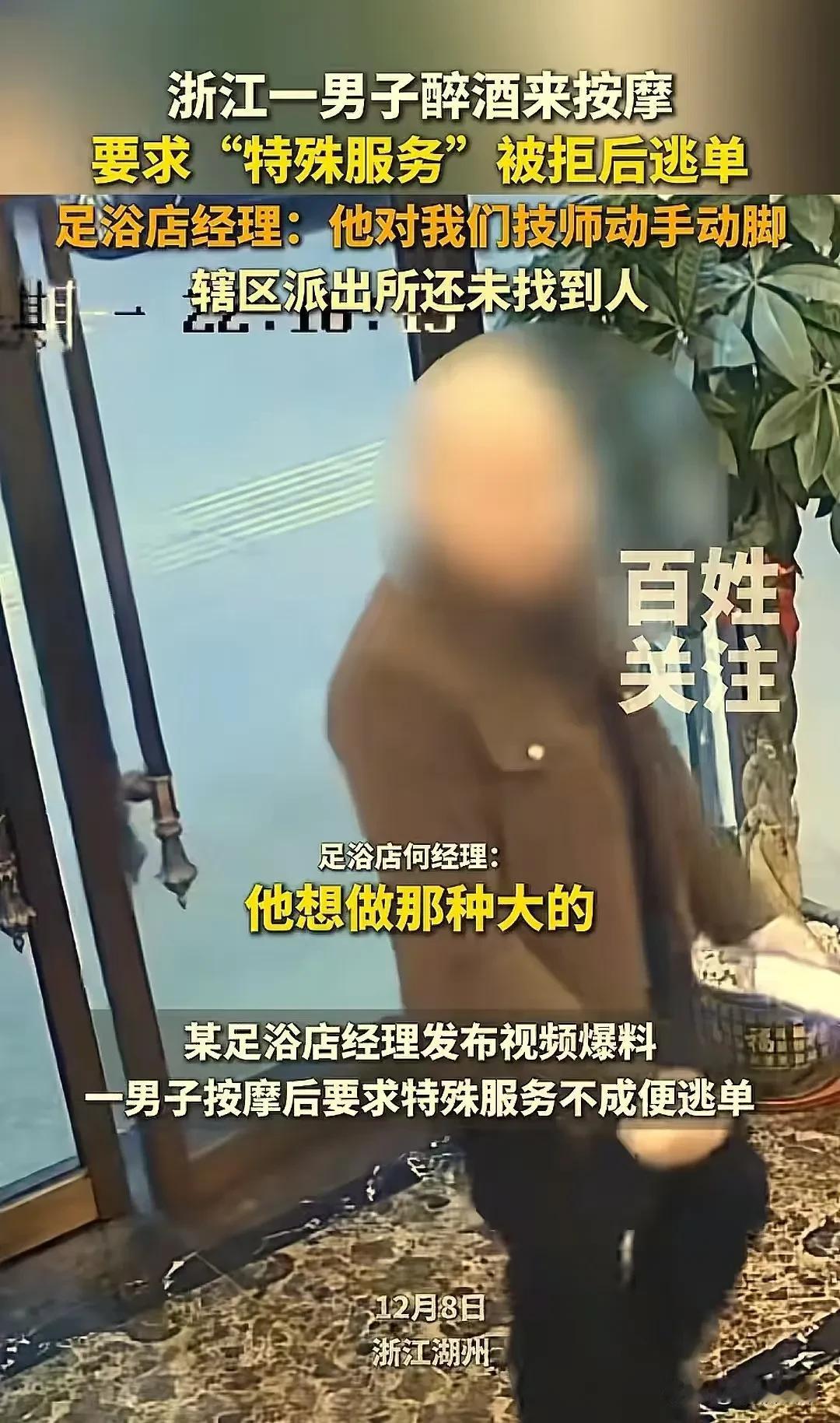 浙江湖州,男子醉酒后去按摩,对女技师动手动脚,还要求女技师提供“特殊服务”!女技师又羞又怒,说自己不是随便的女人,只做正规按摩!而男子被拒后,觉得这钱花的不值,居然逃单了。足浴店气愤不过,选择报案! 监控画面里,男子满脸通红浑身酒气,按摩时手总是不安分地乱摸,嘴里还嘟囔着不堪入耳的话,要求女技师“加项”。女技师多次躲开并明确拒绝,直言店里只做合规项目,劝他自重。谁料男子恼羞成怒,骂骂咧咧说“花了钱没享受到服务”,趁技师转身拿精油的空档,偷偷溜出了店门,连一百多块的按摩费都没付。 店员发现后赶紧追出去,可男子早已不见踪影。无奈之下,足浴店只能报警。民警根据监控很快锁定了男子的行踪,找上门时他还在呼呼大睡,被叫醒后竟还狡辩“是她们服务不到位”。 评论区的网友直接气笑了:“又想耍流氓又想白嫖,脸呢?”“正规按摩嫌不值,咋不去喝西北风呢!”还有人替女技师抱不平:“技师坚守底线没错,这种无赖就该让他留案底!” 说到底,这事儿不仅是逃单那么简单,更是对他人职业的不尊重,对法律的漠视。醉酒不是耍流氓的借口,正规消费更没有“特殊服务”的道理。想占便宜还想赖账,最终只会自食恶果。 你遇到过这种爱占便宜的无赖顾客吗?评论区分享你的经历!