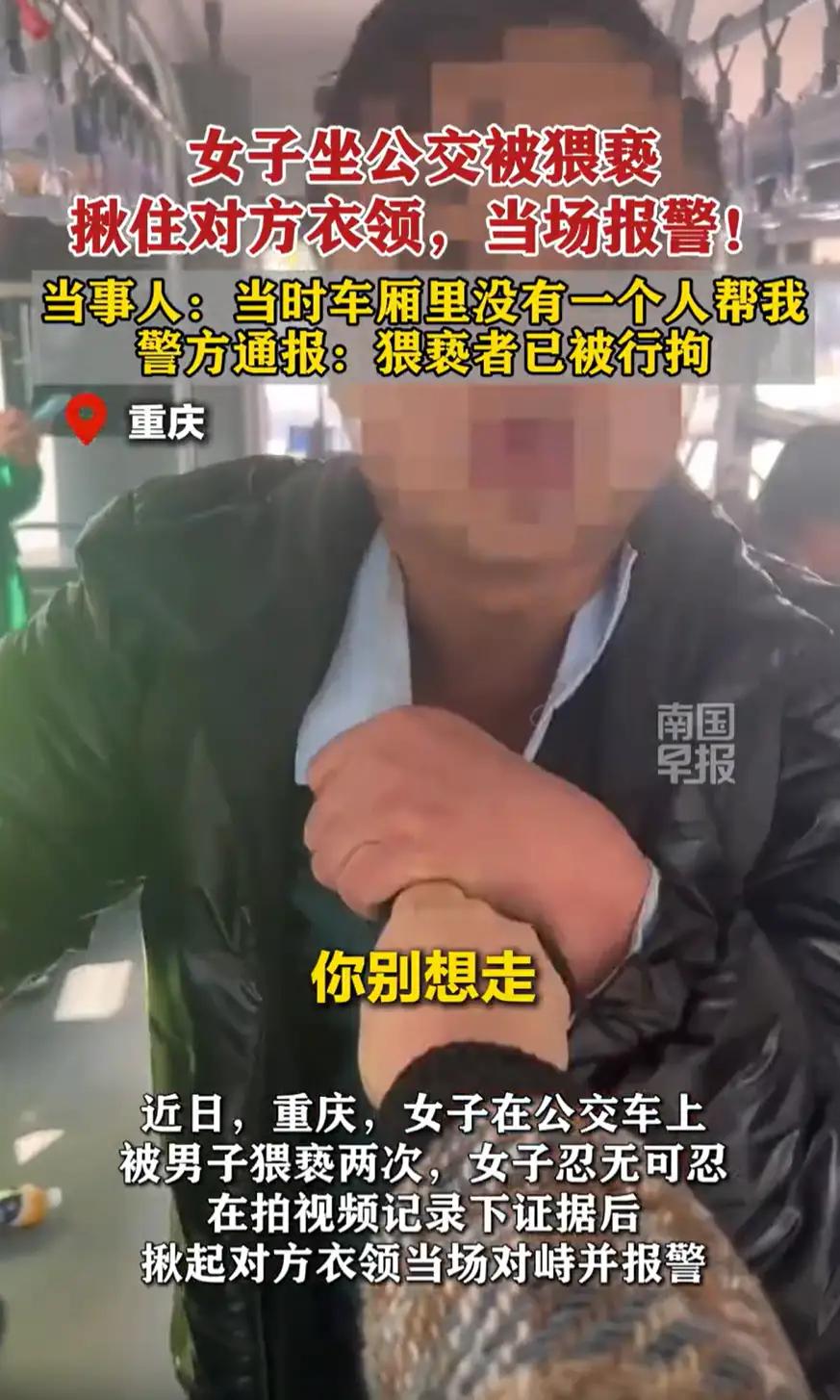重庆,一女子乘坐公交车,突然发现有人再摸自己,她反应过来自己遭到“咸猪手”,于是拿出手机取证,然后当场揪住对方衣领报警,事后猥亵遮被行拘,但让女子不舒服的是,整个过程中车厢里都没人帮她。 画面里一名女子乘车途中,突然察觉到有人在身后对自己实施猥亵行为。意识到遭遇咸猪手后,她没有慌乱退缩,而是迅速拿出手机,冷静地拍下对方的动作作为证据。 随后,她毫不畏惧地转身揪住涉事男子的衣领,大声呵斥其无耻行径,并当即拨打了报警电话。 面对女子的强硬态度,涉事男子瞬间慌了神,试图挣脱辩解。公交车到站后,民警及时赶到,将该男子带回派出所调查。 最终,这名男子被依法行政拘留。 女子的果敢维权赢得了网友的一致称赞,大家纷纷为她的勇气点赞。但让她心生寒意的是,在整个对峙过程中,车厢内的乘客竟无一人上前相助。 见义勇为不仅是道德要求,更是维护公共秩序的重要力量。面对不法行为,若人人都选择沉默旁观,只会让作恶者更加肆无忌惮。期待每个人都能多一份挺身而出的勇气,让冷漠无处遁形。