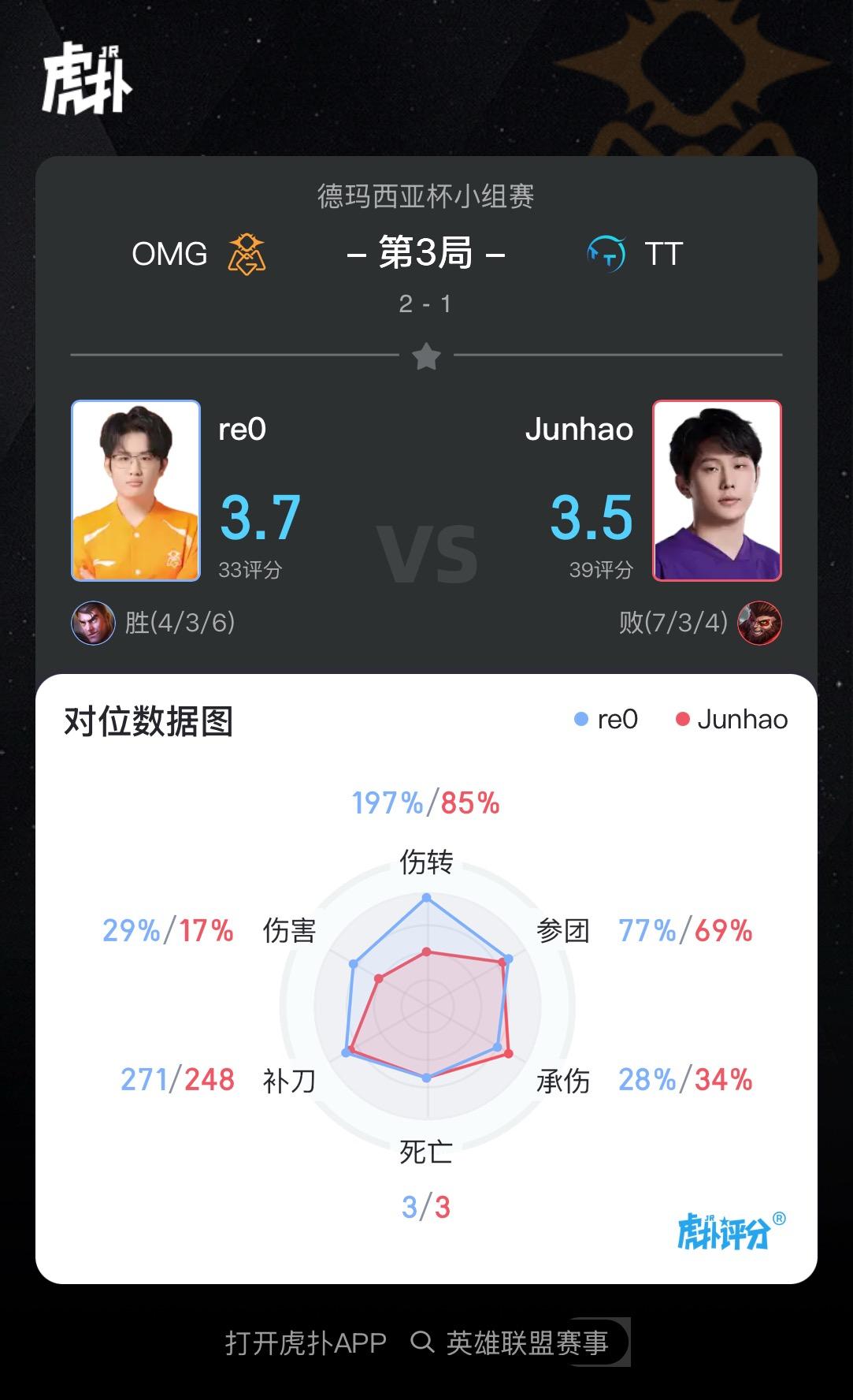 虎扑12月17日讯在刚刚结束的OMG对阵TT的对局中,Re0使用杰斯打出4/3/6战绩,斩获TT对阵OMG第三局MVP