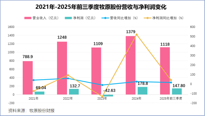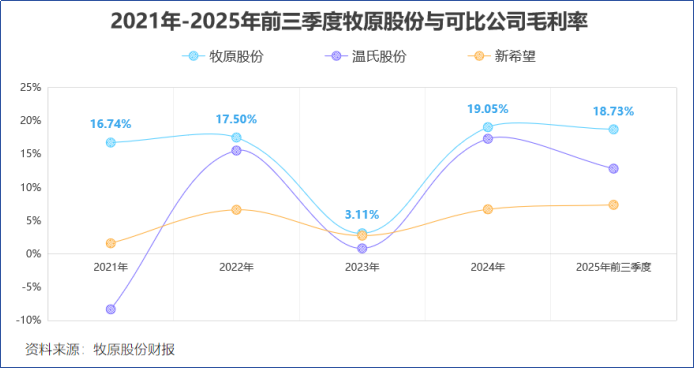 2025年前三季度,公司毛利率上升至18.73%,高于温氏股份与新希望。
