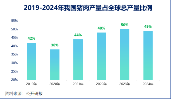 国内是全球最大的猪肉生产国,市场份额约占一半。2025上半年,全国生猪出栏36619万头、猪肉产量高达3020万吨。