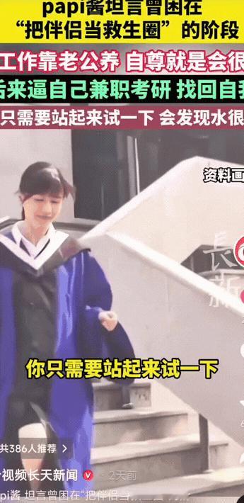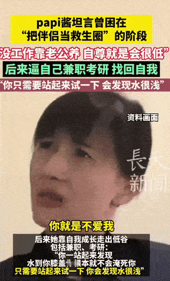 papi酱原来也被老公“包养”过, 在20几岁的时候,papi酱没有工作,全靠老公养,那时候自尊感很低,而且还整天在那瞎想,还玻璃心,她说:“如果他没有满足我的期待,他就是不爱我。” 后面她强迫自己,要慢慢地去干一点事情,接点兼职什么的,跟朋友去做点什么,去考研,你只要站起来试一下,你发现水很浅。 钱,对于女生来讲,就是至大的“补品”,越多越补,但是怎么“补”,如何“补”应该是要掌握在自己手里,这样对自己的人生才有更加坚定的掌控感与确定感,千万不要把这种确定感交付给其他人,因为一旦交付了,换来的将是迷失的自己。
