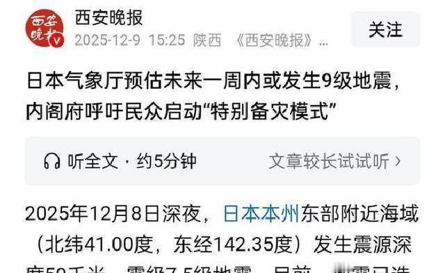 日本专家近期警告日本海北海道附近海沟有可能发生9.0级地震以上(图片来源于网络) 日本处在环太平洋地震带上,地震多是常态,大家都知道。但最近北海道那边千岛海沟的风险又被提出来了。专家们不是随便说说,而是基于长期观测数据。北海道大学和东北大学的研究团队,从2019年开始在千岛海沟附近布设海底观测点,监测板块运动。 结果显示,海洋板块每年向陆地方向挤压大约8厘米,压力积累越来越大,跟17世纪那次大震前的状态挺像。政府地震调查委员会评估,未来30年内这里发生8.8级以上地震的概率在7%到40%之间。如果真到9级,破坏力巨大,海啸可能高达30米,北海道和东北沿海受影响最重,预估死亡人数能到10万左右,甚至更高。 这个海沟跟日本海沟连着,都是太平洋板块俯冲造成的。2011年东日本9.0级大震,就是类似机制。专家说,千岛海沟上一次大释放能量是几百年前,现在积累的应力够触发超级地震。不是说马上就来,但概率在慢慢涨。内阁府做过最坏假设,日本海沟那边9级的话,死亡可能近20万,两边加起来影响更大。冬季发生还麻烦,低温会增加次生伤害。 前阵子2025年12月8日深夜,本州东部近海先来了一次7.5到7.6级地震,震中就在青森县附近,深度50多公里。摇晃传到北海道和东北好几个县,造成三十多人受伤,一些房子损坏,道路塌方,还有上千户停水。超10万人按指示去避难所。 地震后,日本气象厅马上关注,因为位置正好在日本海沟和千岛海沟交接处。凌晨2点,他们首次启动2022年新上的特大逆冲型地震预警系统,发布北海道和三陆沿海的后续地震注意信息。一周内8级以上概率从平时0.1%升到1%,虽然数字小,但对这种级别地震来说,不能忽视。最坏预估9级,日本海沟侧死亡19.9万,千岛海沟侧10万。 这个预警不是预测一定发生,而是提醒大家多准备。类似2011年大震前两天也有7.3级前震。全球统计,7级后一周出8级的案例不多,但日本这地带基础风险高。气象厅说,继续正常生活,但要检查避难包、水食储备,固定家具,确认路线。海啸也来了,最高观测70厘米,后来预警降级并解除。 一周过去,余震有几次6级左右,但没升级成主震。到12月16日左右,气象厅解除注意信息。损伤有限,没大灾难。大家松口气,但这事提醒日本防灾体系得继续加强。专家还是强调千岛海沟长期风险没变,平时多备点东西总没错。住在附近的人,地震包放床边是基本操作。总之,日本地震这事,防大于预测,准备好了损失能少不少。
