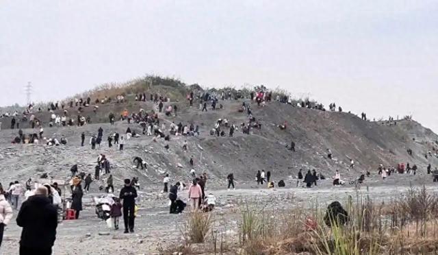 视频显示,在学校与小区之间的一处广场旁泥地上,不少市民带着孩子手持铁锤、钢钎敲打石块,试图寻找化石。甚至有家长为孩子准备了便携电钻用于挖掘。