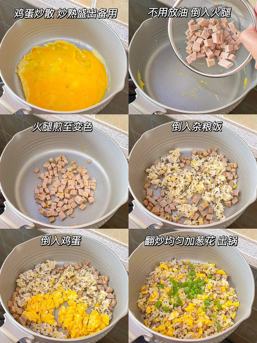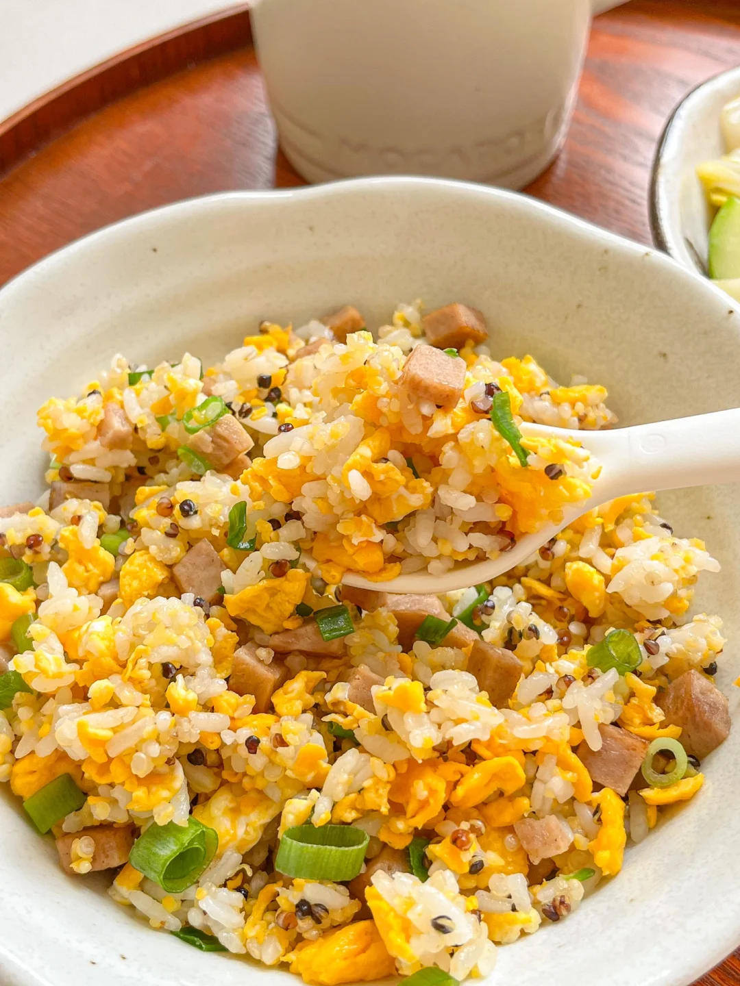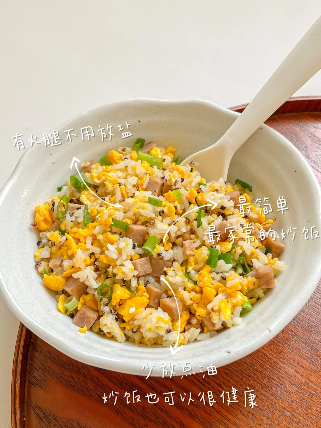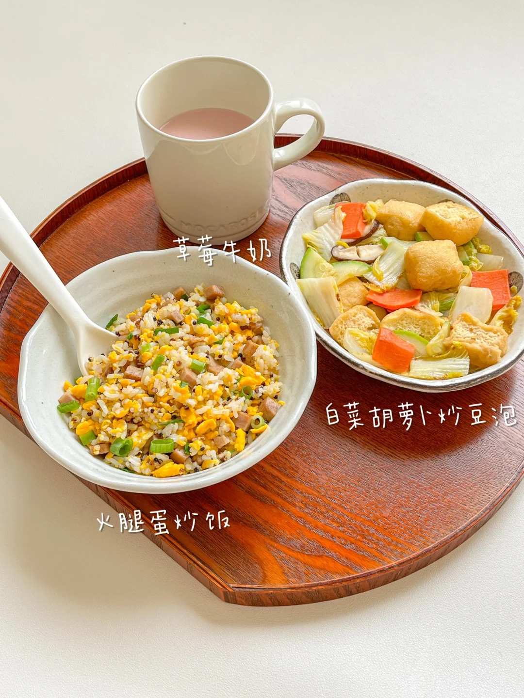 自从在家开始做饭,越来越接受不了餐馆一盘底的油。自己做一份蛋炒饭,吃完盘里了一点油都没有,清清爽爽的盘底。最简单也最家常的蛋炒饭也可以做的低卡又健康[赞R] 今日午餐: ¹鸡蛋火腿炒饭 ²白菜胡萝卜炒豆泡 ³草莓牛奶