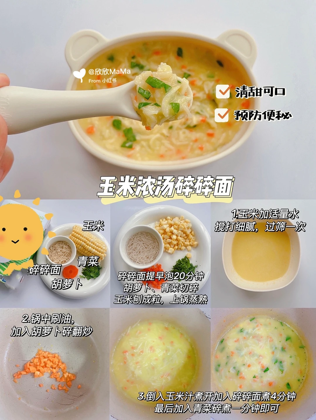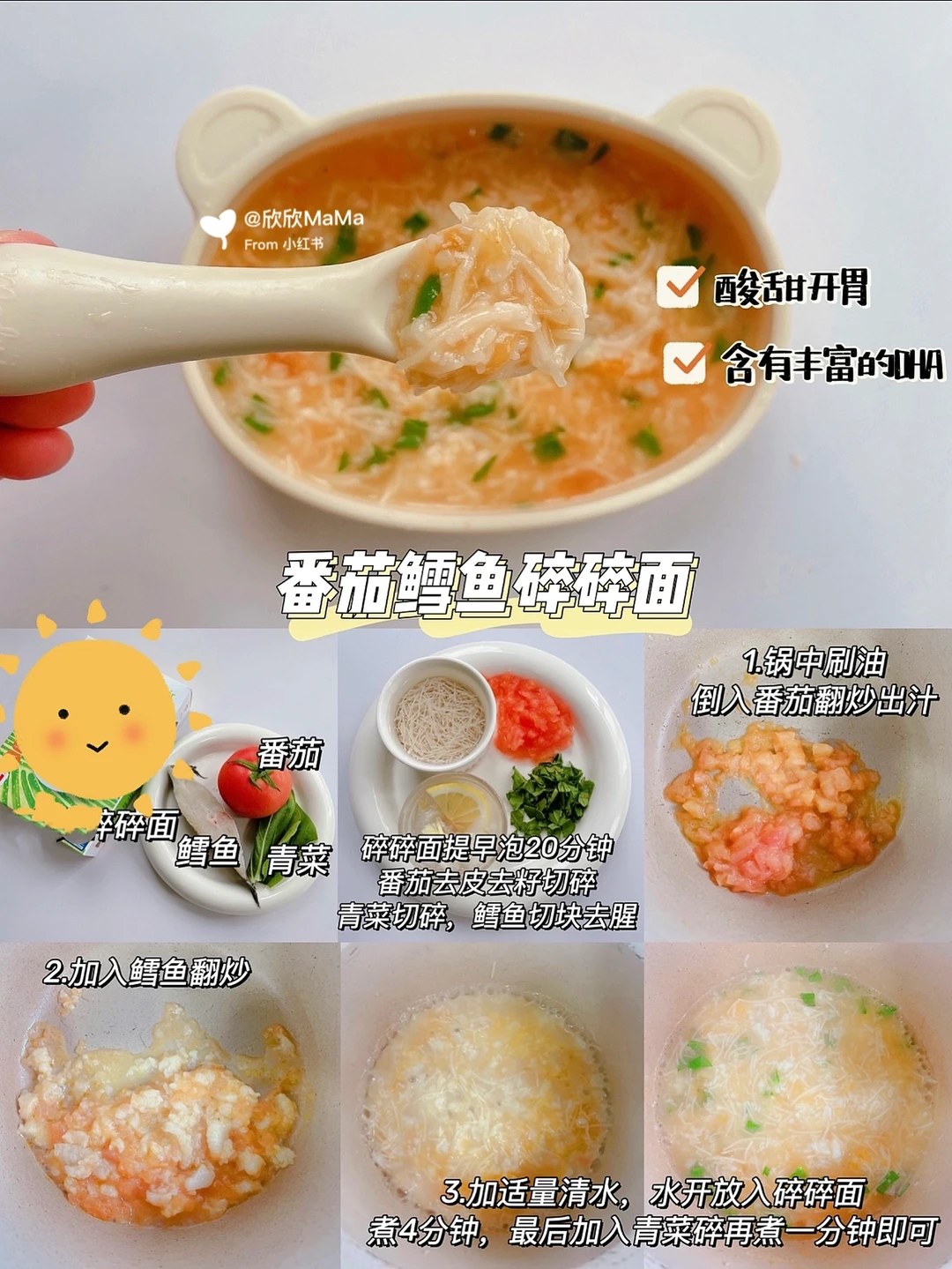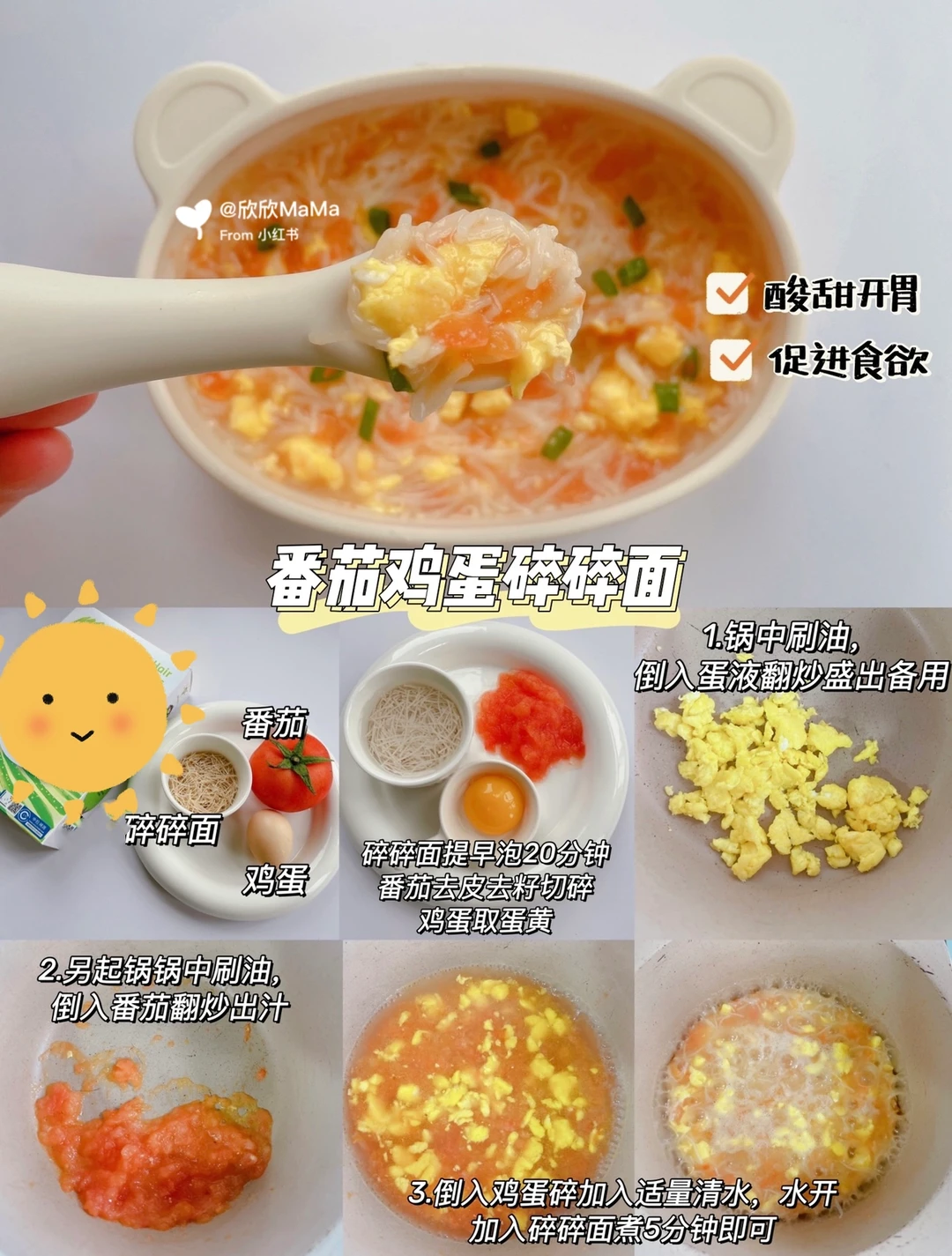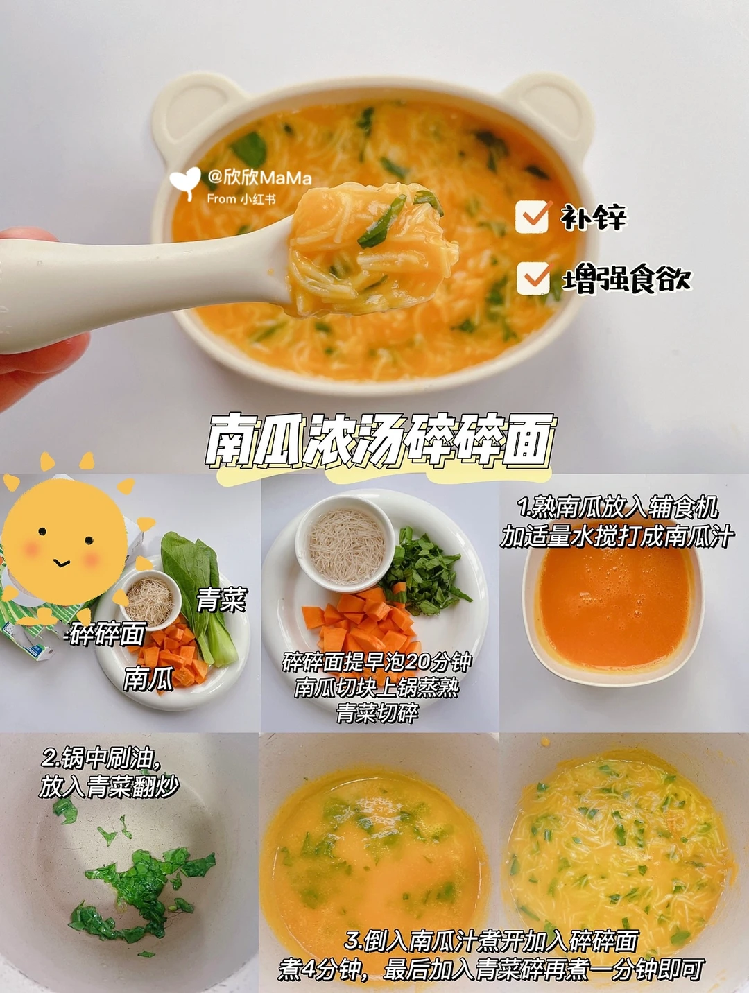宝宝7个月开始就可以尝试宝宝面条啦,食物形状可以稍微增肌一点点颗粒感,帮助宝宝锻炼咀嚼能力~ 今天给大家分享一期小月龄的宝宝面条,做法简单,而且食材搭配好吃营养~妈妈们安排起来哦~ . 🔻宝宝辅食面条的做法: 碎碎面提早用温水浸泡20分钟,这样煮出来的面更软更适合小宝宝~ ️如果宝宝是首次添加辅食面条,可以用研磨碗稍微磨碎、或者煮熟后用辅食剪剪碎哦~ 〰️〰️ 🔸番茄鸡蛋碎碎面 ☑️食材:碎碎面、鸡蛋、番茄 ☑️做法: 1️⃣ 番茄去皮去籽切碎、鸡蛋取蛋黄打散 2️⃣ 锅中刷油,倒入蛋液翻炒盛出备用 3️⃣ 另起锅锅中刷油,倒入番茄翻炒出汁,倒入鸡蛋碎加适量清水,水开加入碎碎面煮5分钟即可 . 🔸番茄鳕鱼碎碎面 ☑️食材:碎碎面、番茄、鳕鱼、青菜 ☑️做法: 1️⃣ 番茄切碎、青菜切碎,鳕鱼用生姜浸泡去腥 2️⃣ 锅中刷油,倒入番茄翻炒出汁,加入鳕鱼翻炒 3️⃣ 加适量温水,水开下碎碎面煮4分钟,最后加入青菜碎再煮一分钟即可 . 🔸玉米浓汤碎碎面 ☑️食材:碎碎面、玉米、青菜、胡萝卜 ☑️做法: 1️⃣ 胡萝卜青菜切碎、玉米剥成粒,上锅蒸熟 2️⃣ 玉米加适量温水搅打成玉米汁,过筛一次 3️⃣ 锅中刷油,加入胡萝卜碎翻炒,倒入玉米汁煮开加入碎碎面煮4分钟,最后加入青菜碎再煮一分钟即可 . 🔸南瓜浓汤碎碎面 ☑️食材:碎碎面、青菜、南瓜 ☑️做法: 1️⃣ 南瓜切块上锅蒸熟、青菜切碎 2️⃣ 南瓜放入辅食机加适量温水搅打成南瓜汁 3️⃣ 锅中刷油,放入青菜翻炒,倒入南瓜汁煮开加入碎碎面煮4分钟,最后加入青菜碎再煮一分钟即可 . 🔸番茄香菇牛肉碎碎面 ☑️食材:碎碎面、番茄、香菇、牛肉 ☑️做法: 1️⃣ 番茄去皮去籽切碎,香菇切片,牛肉切块用生姜水浸泡去腥 2️⃣ 香菇锅中焯水煮熟、牛肉锅中焯水去浮沫后煮熟、香菇牛肉放入辅食机搅打 3️⃣ 锅中刷油,放入番茄翻炒出汁加入香菇牛肉翻炒,加适量清水煮开,放入碎碎面煮5分钟即可 . ⚠️其他款做法请看图2-图9 ⚠️大点宝宝也可以吃哦 面条可以随意切换加点酱油或盐调味! . 有疑问🤔️也可以评论区留言喔 关注我带您解锁更多辅食制作