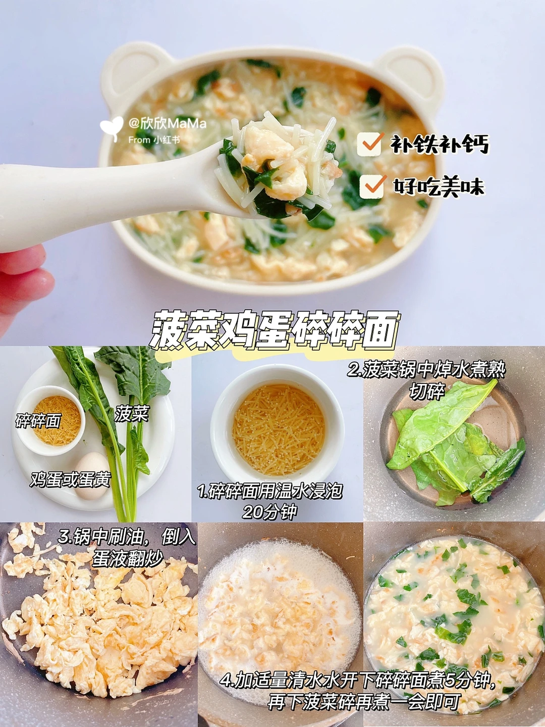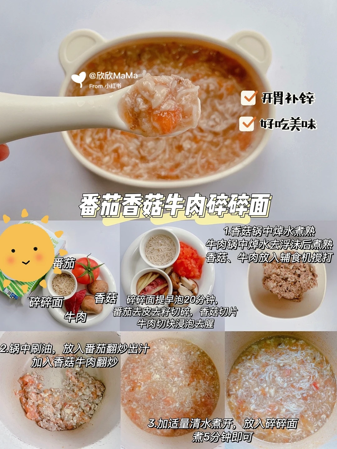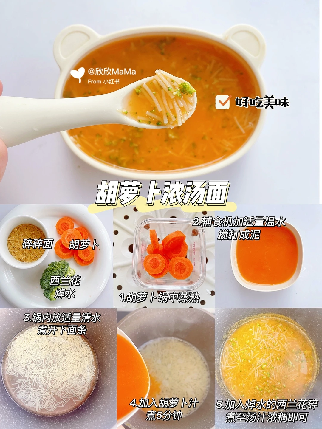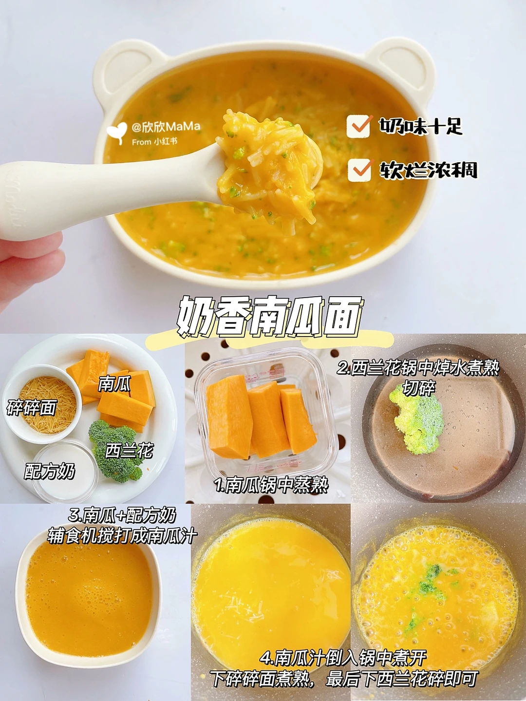 宝宝7个月开始就可以尝试宝宝面条啦,食物形状可以稍微增肌一点点颗粒感,帮助宝宝锻炼咀嚼能力~ 今天给大家分享一期小月龄的宝宝面条,做法简单,而且食材搭配好吃营养~妈妈们安排起来哦~ . 🔻宝宝辅食面条的做法: 碎碎面提早用温水浸泡20分钟,这样煮出来的面更软更适合小宝宝~ ️如果宝宝是首次添加辅食面条,可以用研磨碗稍微磨碎、或者煮熟后用辅食剪剪碎哦~ 〰️〰️ 🔸番茄鸡蛋碎碎面 ☑️食材:碎碎面、鸡蛋、番茄 ☑️做法: 1️⃣ 番茄去皮去籽切碎、鸡蛋取蛋黄打散 2️⃣ 锅中刷油,倒入蛋液翻炒盛出备用 3️⃣ 另起锅锅中刷油,倒入番茄翻炒出汁,倒入鸡蛋碎加适量清水,水开加入碎碎面煮5分钟即可 . 🔸番茄鳕鱼碎碎面 ☑️食材:碎碎面、番茄、鳕鱼、青菜 ☑️做法: 1️⃣ 番茄切碎、青菜切碎,鳕鱼用生姜浸泡去腥 2️⃣ 锅中刷油,倒入番茄翻炒出汁,加入鳕鱼翻炒 3️⃣ 加适量温水,水开下碎碎面煮4分钟,最后加入青菜碎再煮一分钟即可 . 🔸玉米浓汤碎碎面 ☑️食材:碎碎面、玉米、青菜、胡萝卜 ☑️做法: 1️⃣ 胡萝卜青菜切碎、玉米剥成粒,上锅蒸熟 2️⃣ 玉米加适量温水搅打成玉米汁,过筛一次 3️⃣ 锅中刷油,加入胡萝卜碎翻炒,倒入玉米汁煮开加入碎碎面煮4分钟,最后加入青菜碎再煮一分钟即可 . 🔸南瓜浓汤碎碎面 ☑️食材:碎碎面、青菜、南瓜 ☑️做法: 1️⃣ 南瓜切块上锅蒸熟、青菜切碎 2️⃣ 南瓜放入辅食机加适量温水搅打成南瓜汁 3️⃣ 锅中刷油,放入青菜翻炒,倒入南瓜汁煮开加入碎碎面煮4分钟,最后加入青菜碎再煮一分钟即可 . 🔸番茄香菇牛肉碎碎面 ☑️食材:碎碎面、番茄、香菇、牛肉 ☑️做法: 1️⃣ 番茄去皮去籽切碎,香菇切片,牛肉切块用生姜水浸泡去腥 2️⃣ 香菇锅中焯水煮熟、牛肉锅中焯水去浮沫后煮熟、香菇牛肉放入辅食机搅打 3️⃣ 锅中刷油,放入番茄翻炒出汁加入香菇牛肉翻炒,加适量清水煮开,放入碎碎面煮5分钟即可 . ⚠️其他款做法请看图2-图9 ⚠️大点宝宝也可以吃哦 面条可以随意切换加点酱油或盐调味! . 有疑问🤔️也可以评论区留言喔 关注我带您解锁更多辅食制作