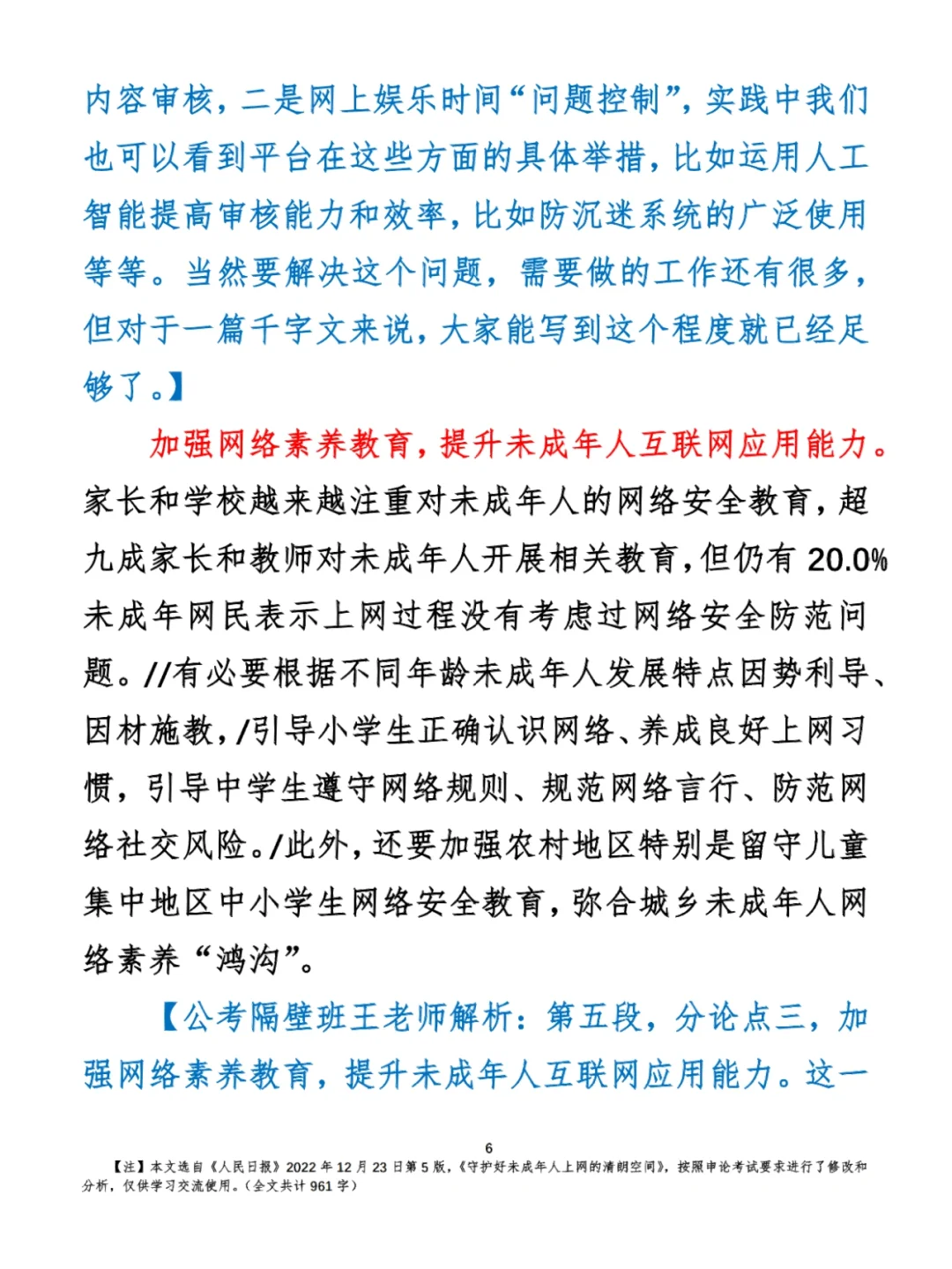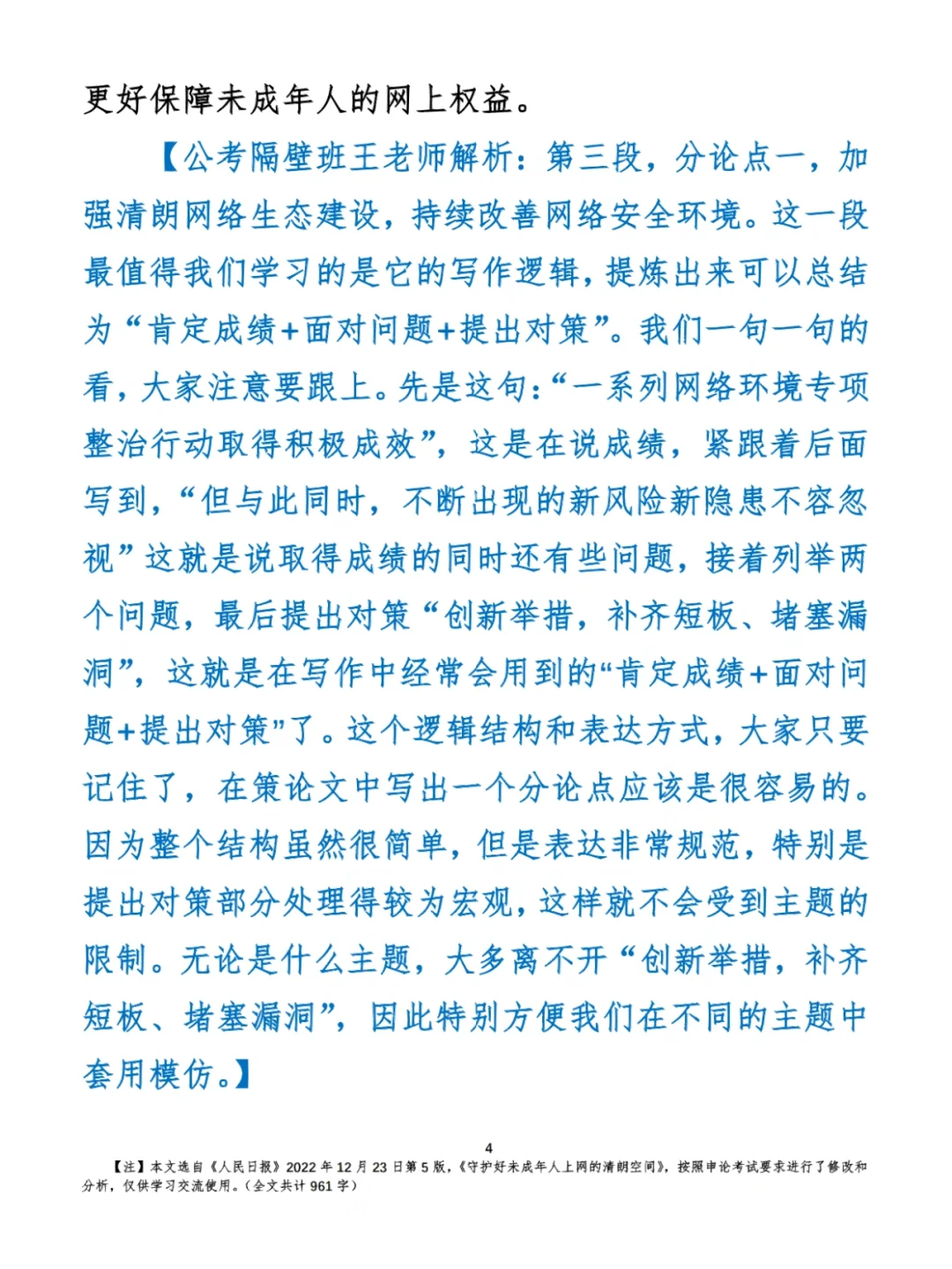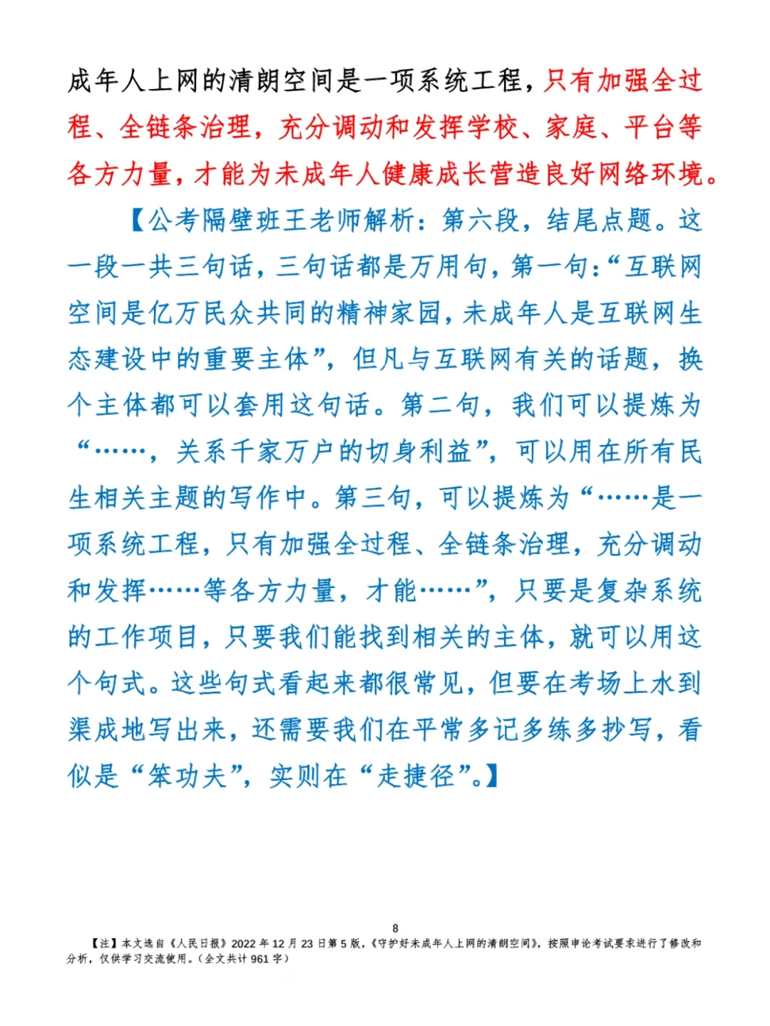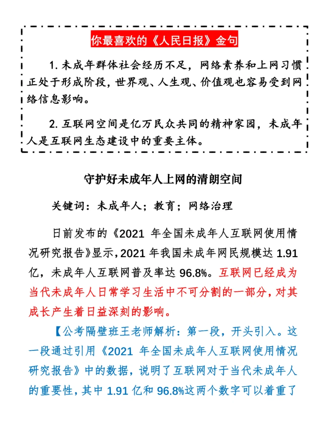 今日打卡作业: 1. 选一句你最喜欢的金句 2. 抄写全文红字+划线部分内容 3. 写完后在留言区打卡 ⭐️ ⭐️ ⭐️ ⭐️ ⭐️ ⭐️ 如何抄写:每天的抄写文章以图片形式发在“公考隔壁班王老师”账号,红色字是重点句和结构句,黑色字是正文,蓝色字是解析,大家抄写时不必抄蓝色字。建议先通读全文(包括蓝色解析部分),做到心中有数再开始抄写,效果会更好。 关于文章:抄写文章来源于人民日报,但每篇文章我都根据申论考试要求进行了修改,主要集中在四个方面:一是重写或修改开头、结尾;二是统一段首句句式结构;三是调整段落字数,使文章结构更均衡;四是简化复杂长难句,使之更具可模仿性。每篇文章修改幅度不同,无论修改多少,都是基于申论考试要求,毫无对人民日报文章品评之意。(此处致敬人民日报) 关于解析:我会在文章每段后面加一段蓝色字的解析,是我自己在抄写时的感悟,篇幅时间有限,不能面面俱到,但求重点突出。如果你有其他感悟,也希望能在评论里分享,我们相互学习、共同进步。 ⭐️ ⭐️ ⭐️ ⭐️ ⭐️ ⭐️ 这里是公考隔壁班王老师独创的“每天半小时・申论80分”抄写团,欢迎加入我们!