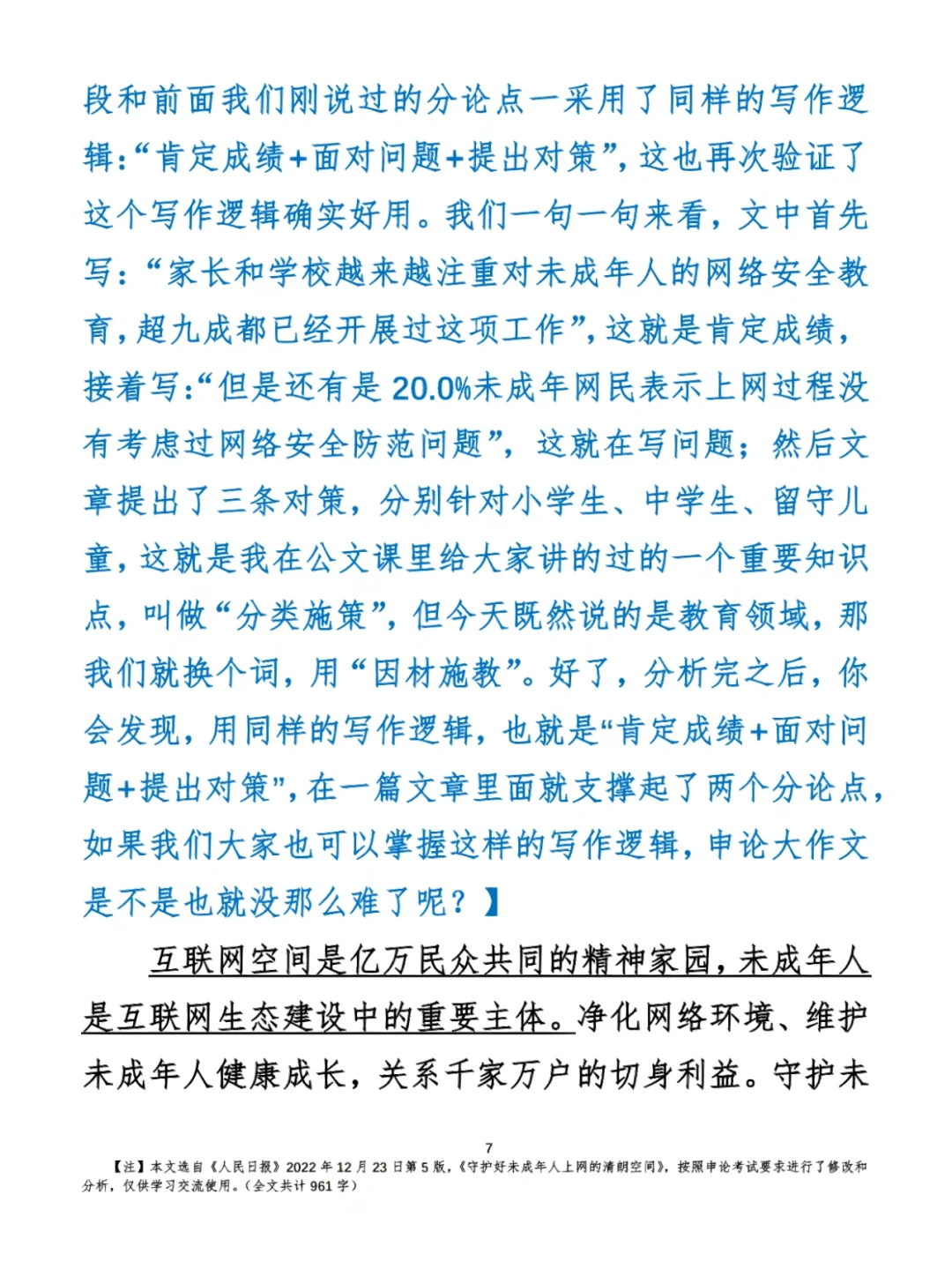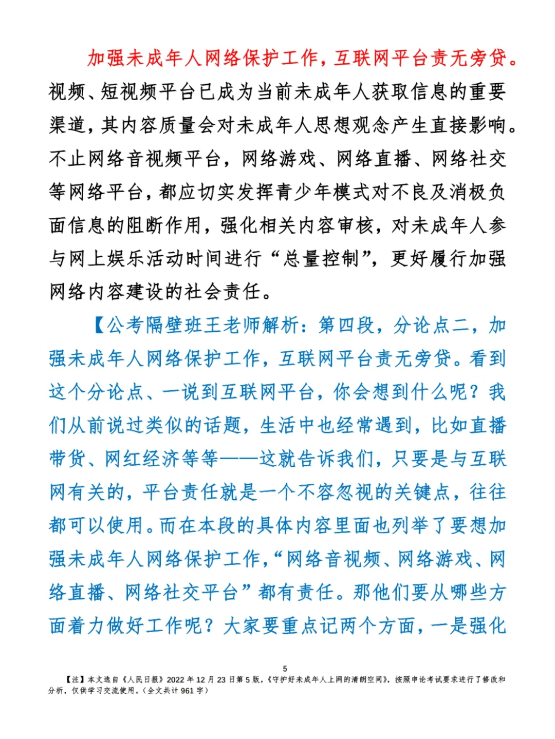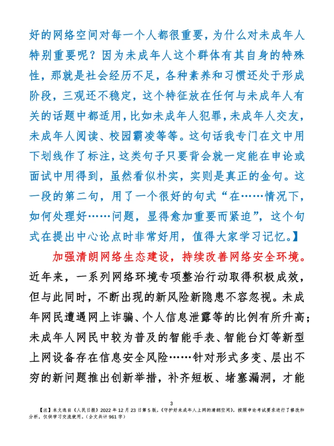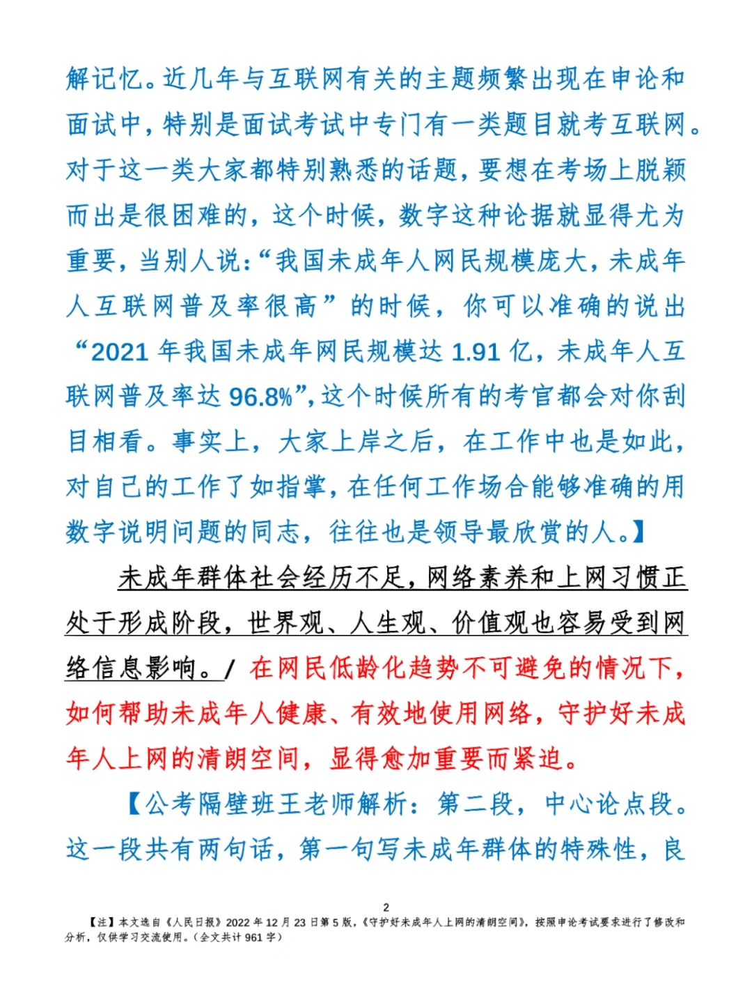 今日打卡作业: 1. 选一句你最喜欢的金句 2. 抄写全文红字+划线部分内容 3. 写完后在留言区打卡 ⭐️ ⭐️ ⭐️ ⭐️ ⭐️ ⭐️ 如何抄写:每天的抄写文章以图片形式发在“公考隔壁班王老师”账号,红色字是重点句和结构句,黑色字是正文,蓝色字是解析,大家抄写时不必抄蓝色字。建议先通读全文(包括蓝色解析部分),做到心中有数再开始抄写,效果会更好。 关于文章:抄写文章来源于人民日报,但每篇文章我都根据申论考试要求进行了修改,主要集中在四个方面:一是重写或修改开头、结尾;二是统一段首句句式结构;三是调整段落字数,使文章结构更均衡;四是简化复杂长难句,使之更具可模仿性。每篇文章修改幅度不同,无论修改多少,都是基于申论考试要求,毫无对人民日报文章品评之意。(此处致敬人民日报) 关于解析:我会在文章每段后面加一段蓝色字的解析,是我自己在抄写时的感悟,篇幅时间有限,不能面面俱到,但求重点突出。如果你有其他感悟,也希望能在评论里分享,我们相互学习、共同进步。 ⭐️ ⭐️ ⭐️ ⭐️ ⭐️ ⭐️ 这里是公考隔壁班王老师独创的“每天半小时・申论80分”抄写团,欢迎加入我们!