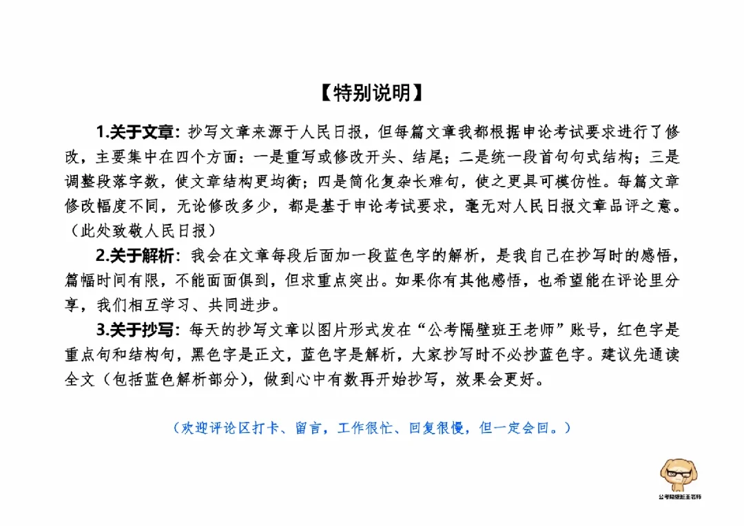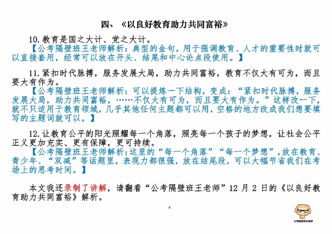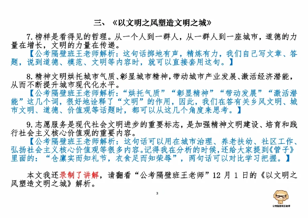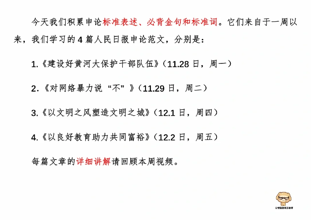 今天我们积累申论素材、必背金句和重点知识。它们来自于一周以来,我们学习的4篇人民日报申论范文,分别是: 1.《建设好黄河大保护干部队伍》(11.28日,周一) 2.《对网络暴力说“不”》(11.29日,周二) 3.《以文明之风塑造文明之城》(12.1日,周四) 4.《以良好教育助力共同富裕》(12.2日,周五) 今天,我们就总结学习一下里面的“万能金句”。 每篇文章的详细讲解请回顾本周视频。 ⭐ ⭐ ⭐ ⭐ ⭐ ⭐ 这里是公考隔壁班王老师独创的“每天半小时・申论80分”抄写团,欢迎加入我们!