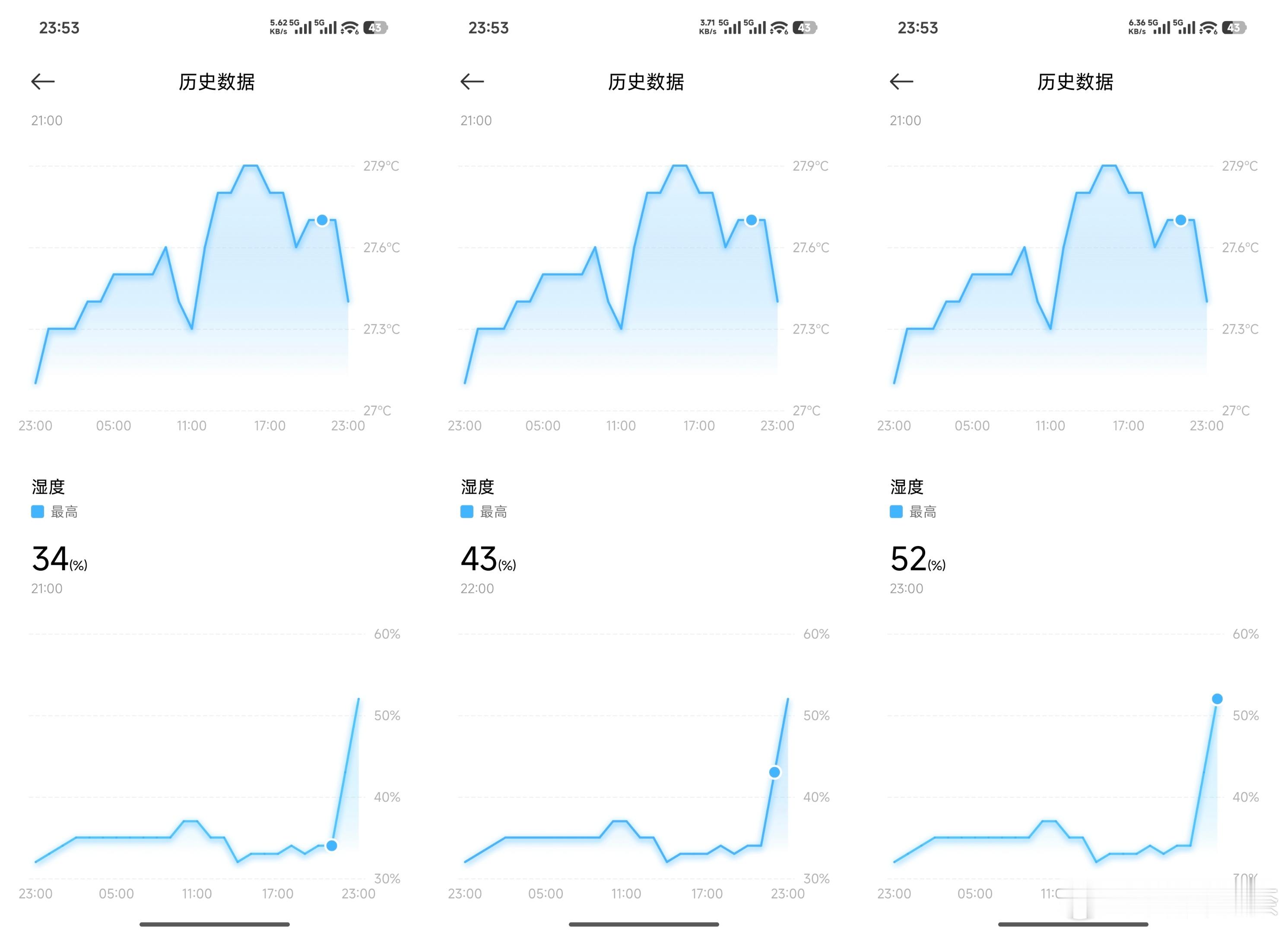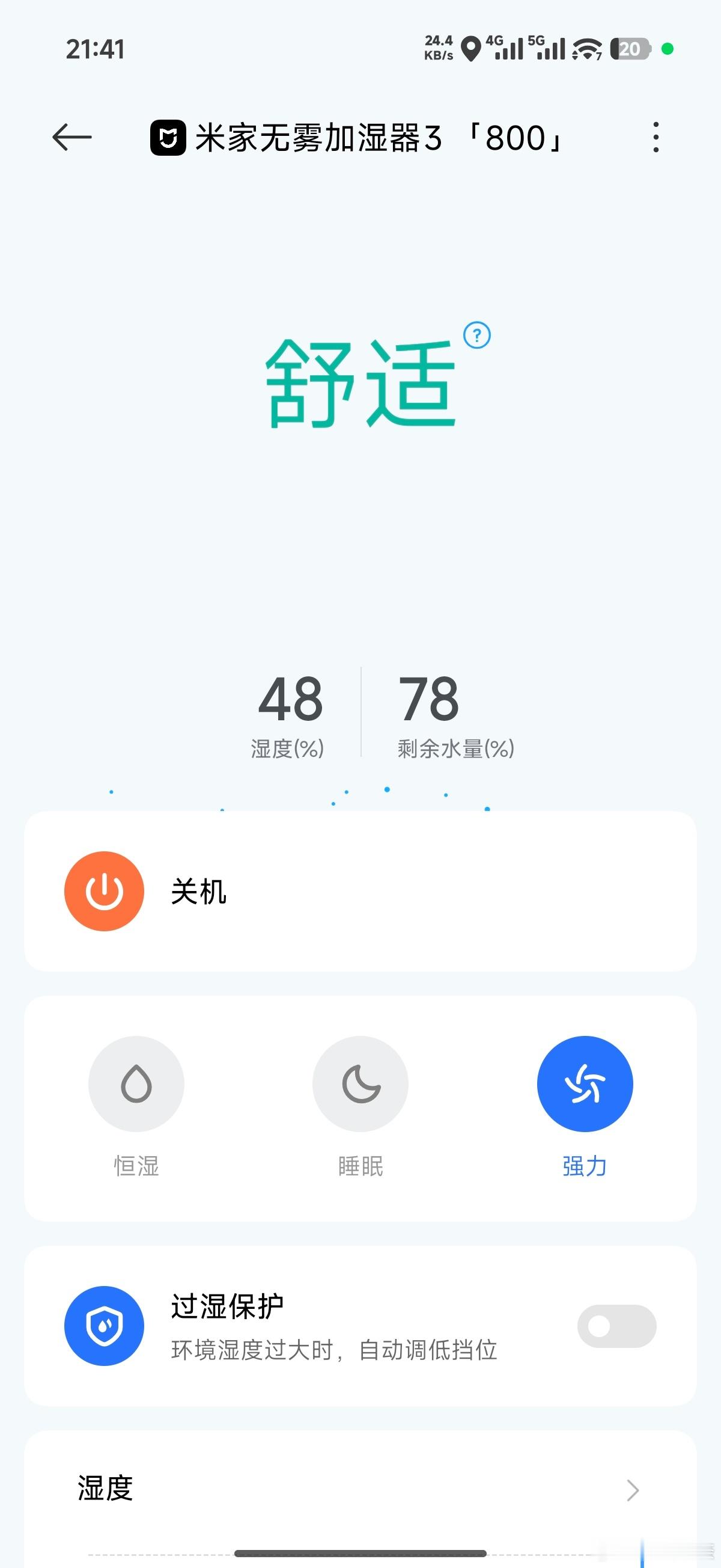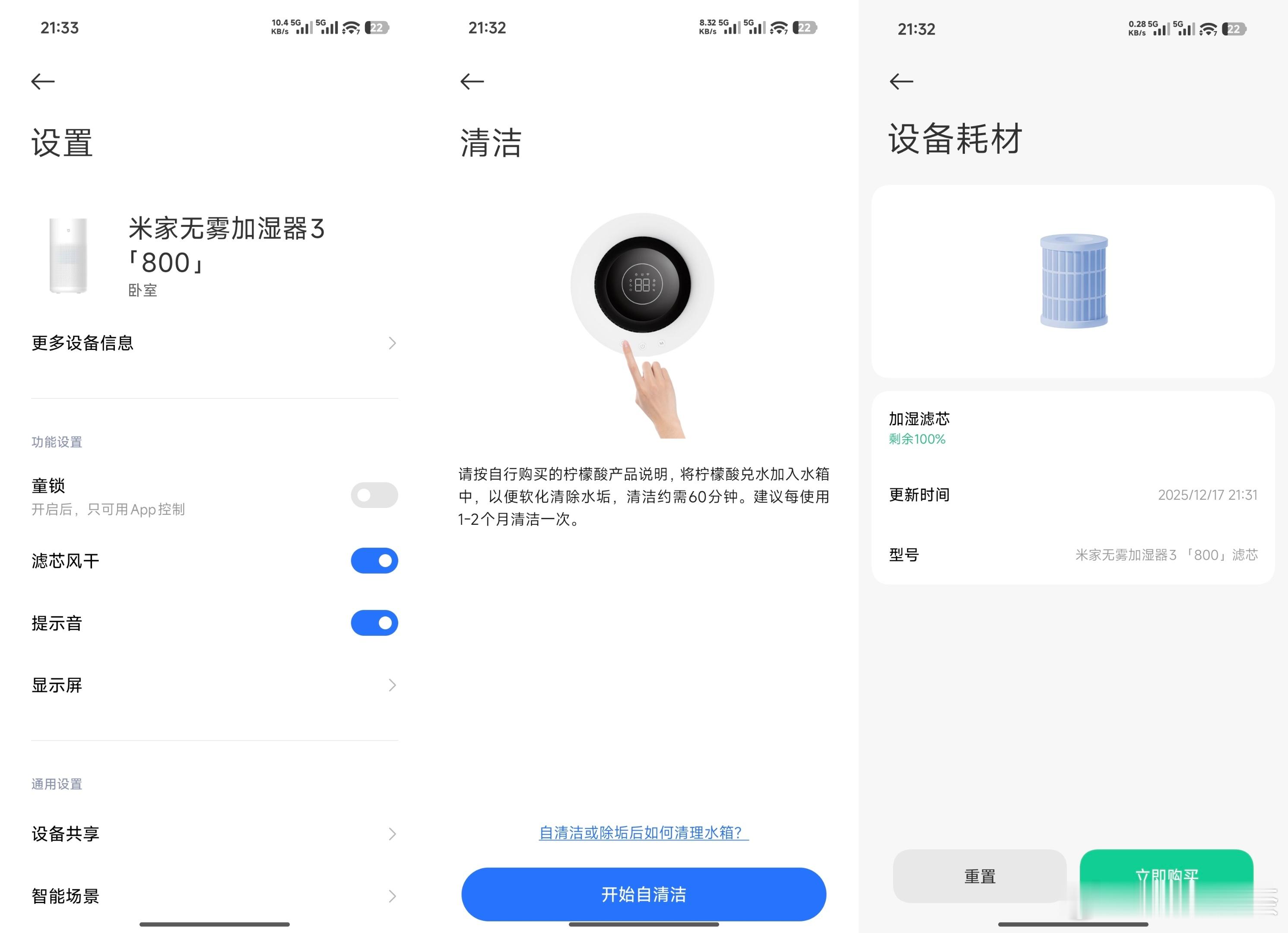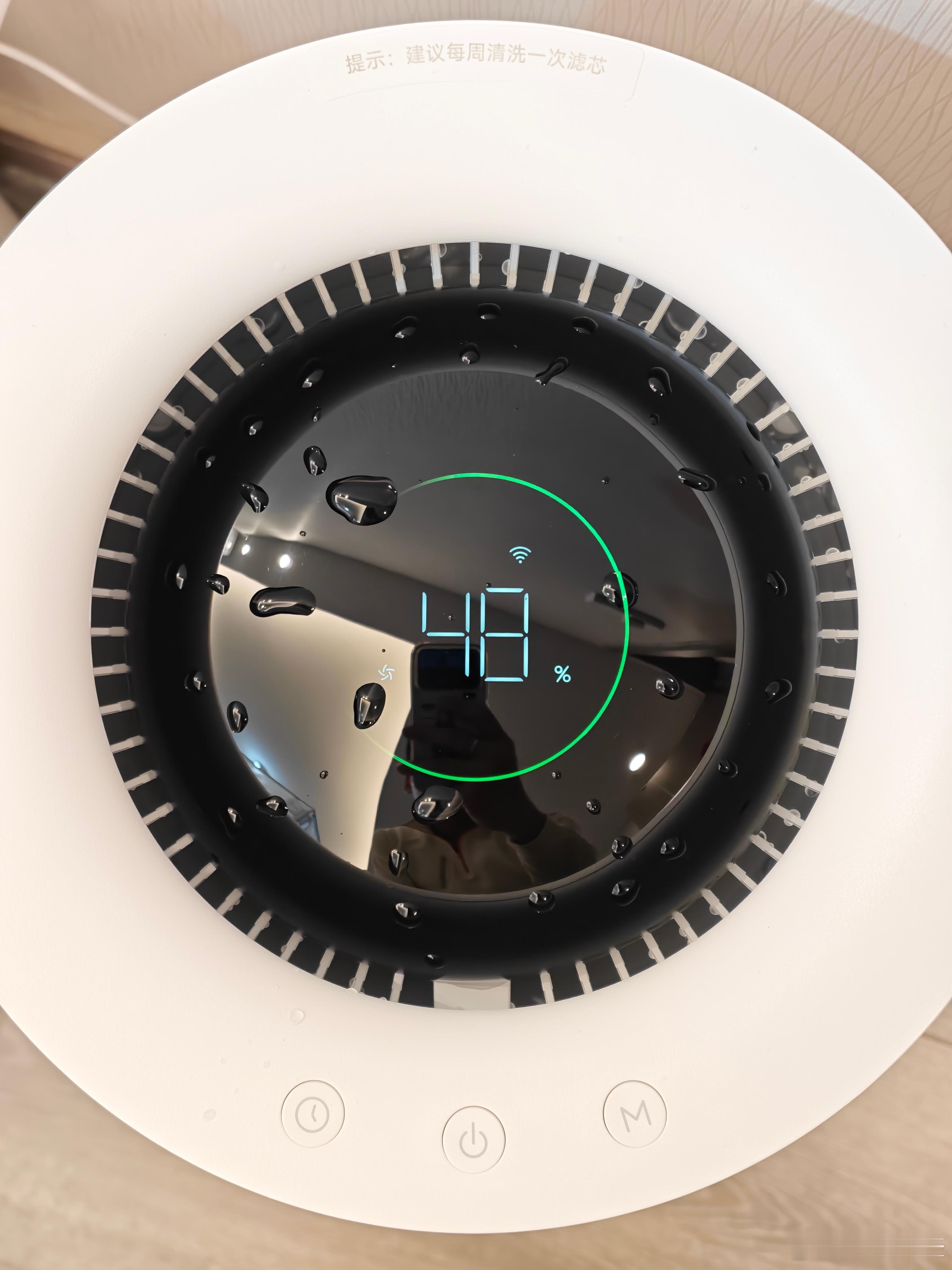 这段时间自从通了地暖,家里暖和是暖和,但实在是太干了,每天早上醒来都得干咳,而且感觉家里整体浮灰也变多了,但前几年用加湿器的经验也确实没给我留下太好的印象,找了好几天别的办法,最后还是觉得加湿器可能会更稳妥。现在已经美滋滋的用上了,这款颜值什么的不必说,统一风格还是很对人胃口的,上加水的方式也会方便不少,最关键的就是滤芯的升级,跟我几年前用的那种把滤芯泡在水里的不同,这个相当于是把水抽上来然后淋在滤芯上,而且滤芯可以拆下来直接扔进洗衣机里去洗,然后功能上也有滤芯风干和自清洁的加入,确实很大程度上解决了滤芯发霉这个问题。刚插上那会房间湿度32,强力模式开了会到40多,现在开着房间门,也基本稳定在52左右了,美滋滋。准备完事给下面买个带轮子的托盘,白天放客厅晚上放卧室用着。