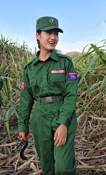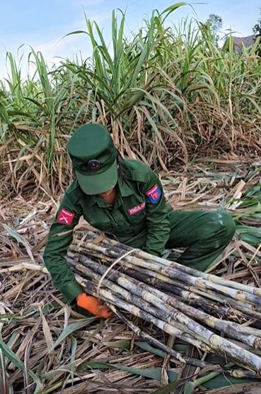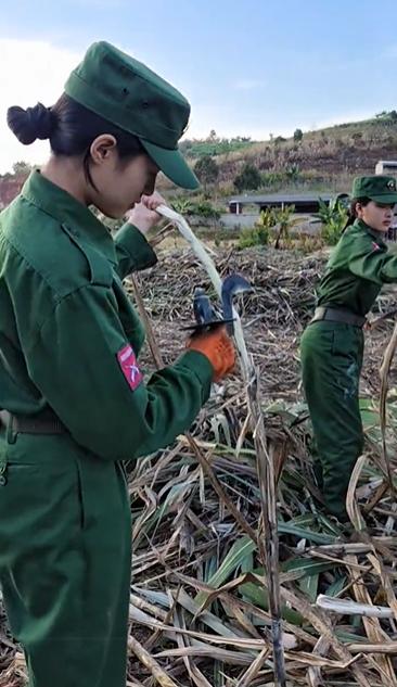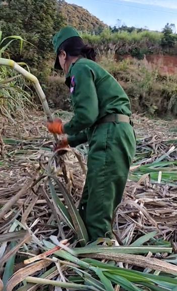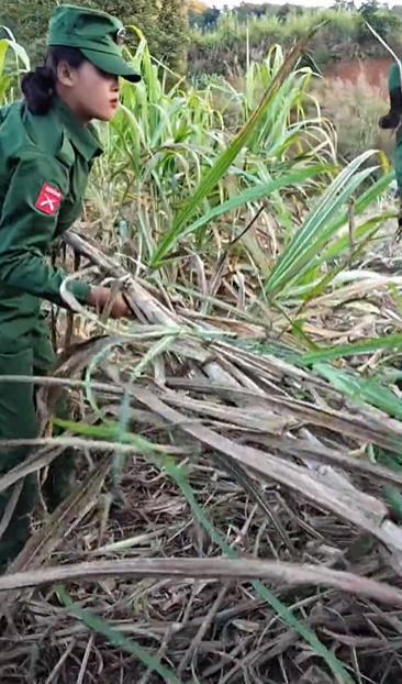 果敢同盟军女兵砍得甘蔗真瘦弱呀! 就这么细的甘蔗,又细又弯,跟发育不良一样,没
