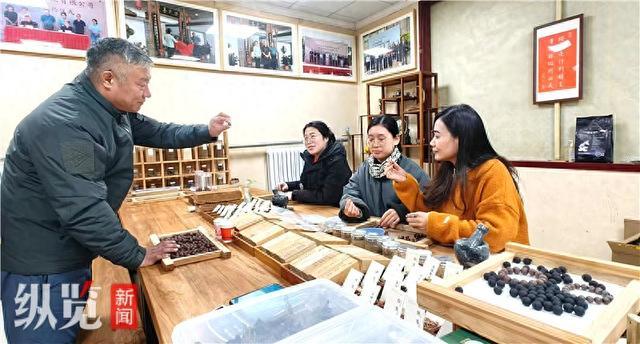 12月16日,在谷氏香非遗传承基地内,谷俊明(左)正为研学者讲解香珠制作方法。河北日报记者刘英摄