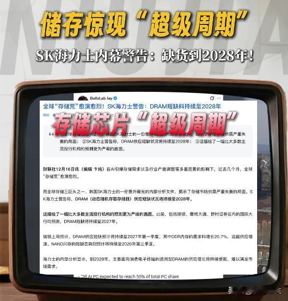 内部文件曝光! “短缺持续到2028年”并非营销话术,SK海力士指出,标准型DRAM的供应紧张局面将持续到2028年 。 三个判断:1. 产能扩张周期漫长。2. AI需求“虹吸”效应。3. 库存已降至“安全线”以下。 市场炒作的就是涨价和需求高企,对股民而言,涨价周期拉长使存储板块盈利高景气阶段超预期延伸。虽然该板块已涨了很高了,相关核心公司调整后依然有机会再走一波,说到底,还是要靠业绩说话的,好的产品,市场需要的就是未来方向。