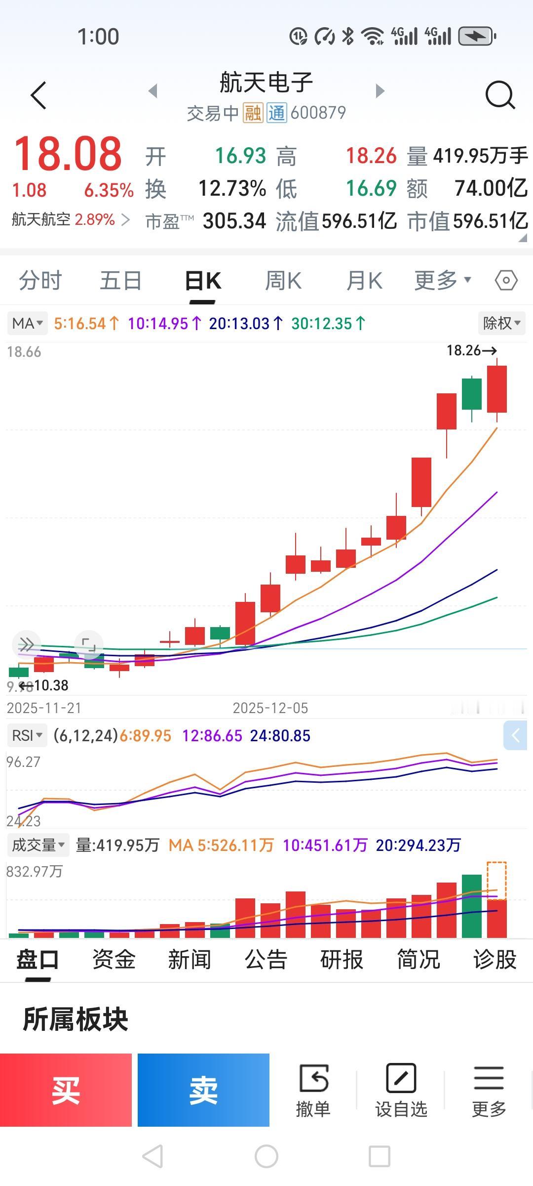 今天我的航天电子卖飞了,悔的肠子都青了。 昨天的下跌,让我产生了恐慌心理,感觉航天板块都在回调,航天电子也差不多了,就想今天卖出。 我是在17.1卖出的,成交后他就一直上涨,我看着向上跳动的红字,心里真是五味杂陈,为什么你那么着急,再等等不好吗?最高都涨到18.26上了。 亏损与盈利就在那一瞬间,我当时也是看成交量在流出的时候才决定的,没想到可能是庄家在诱惑你卖出,他来接单。就这么白白的错过了7%的利润。你们买过航天电子的吗?是卖出了还是买入,留下你的操作建议,让我们共同学习。