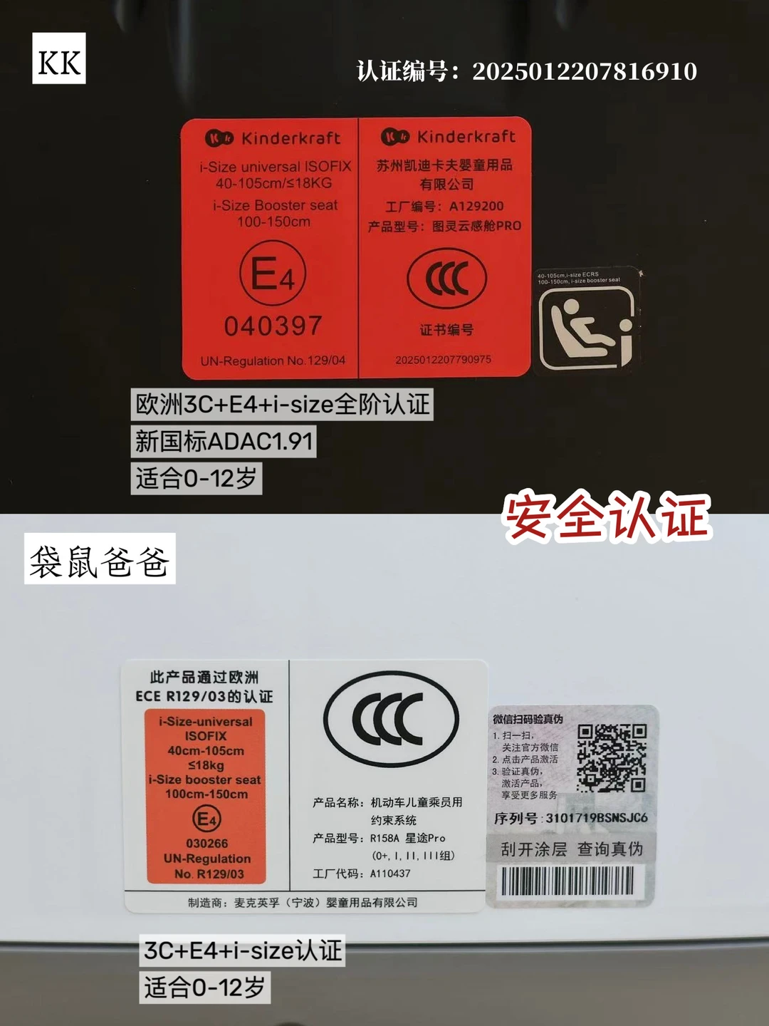 ▪KK:3C+欧盟E4+I-SIZE全阶(0-12岁)+新国标+ADAC 1.91,新国标GB 27887-2024、ADAC评分1.91(超高分)全通过