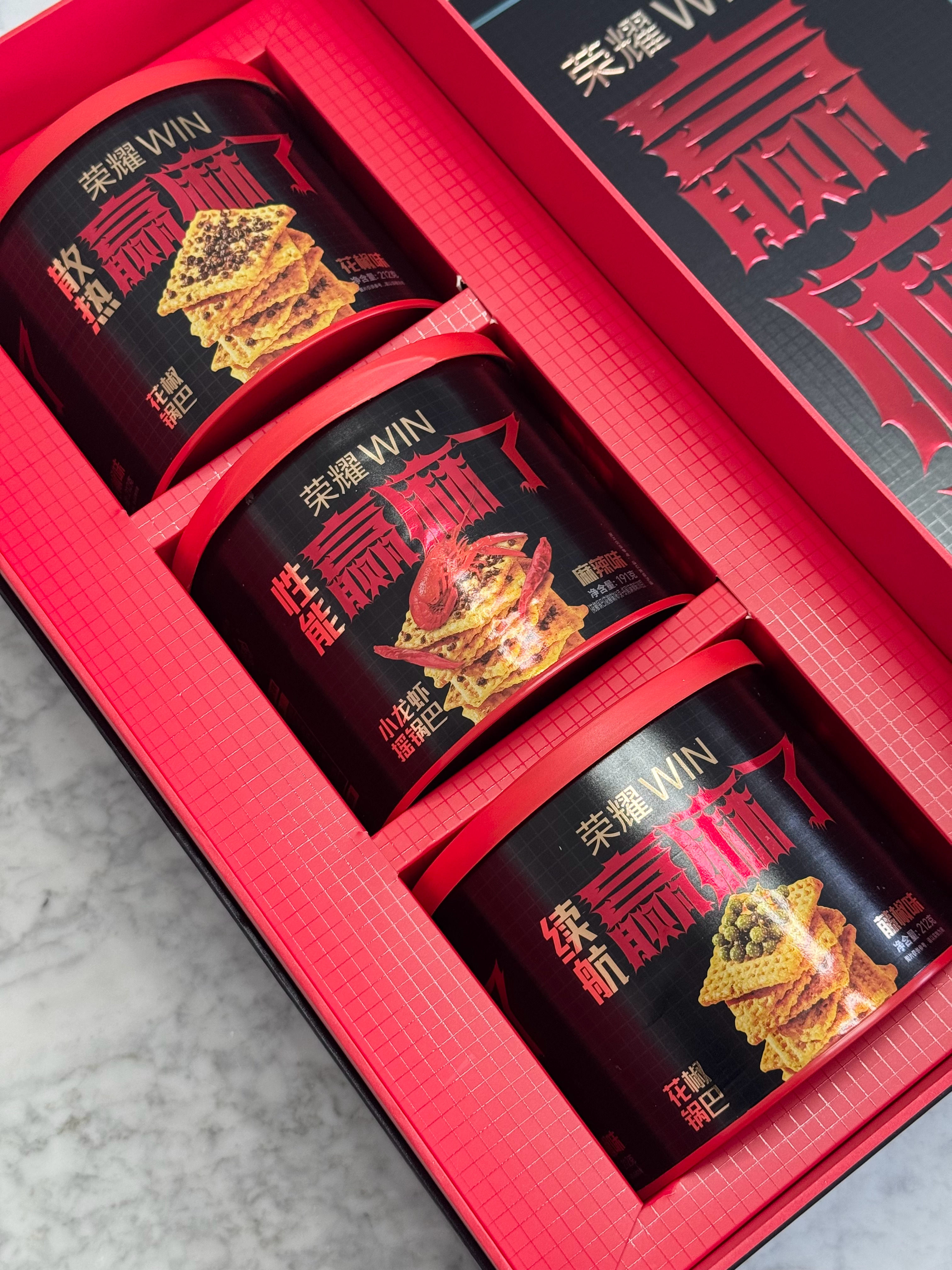 荣耀WIN系列邀请函!三盒锅巴,花椒、藤椒、麻辣三种味。赢麻了,先把嘴巴麻掉!新