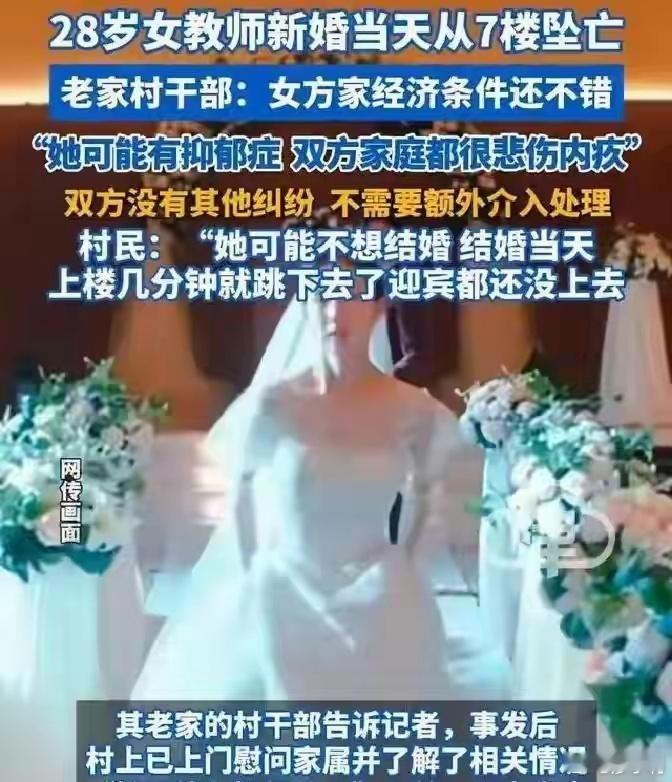 坠亡女教师娘家夫家互相推脱最冤的是一楼住户,挺倒霉的,新买的房子刚装修完准备入住,就摊上了这种事。很多人买房都图个好彩头,经这么一遭,别提多别扭了。还有新郎家也是挺冤的,婚礼还没举行完,新娘就没了,他这到底是结婚还是没结婚?搭进去的27万彩礼钱还拿得回来么?虽说人死为大,但作为知识分子的新娘,她可以不结婚,也可以有很多种方式逃避这场婚姻,为什么要在婚前婚房跳楼?这是极不负责任的行为!给新郎一家人及这栋楼的居民带来的心理伤害及阴影,恐怕这㹃子都无法抹去!热点观点