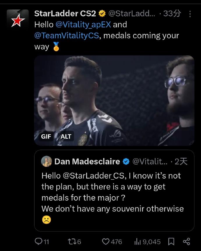 虎扑12月18日讯StarLadder已听取apEX建议补发布达佩斯major冠军奖牌,StarLadderCS2:你好@Vitality_apEX和@TeamVitalityCS,奖牌马上给你们安排上