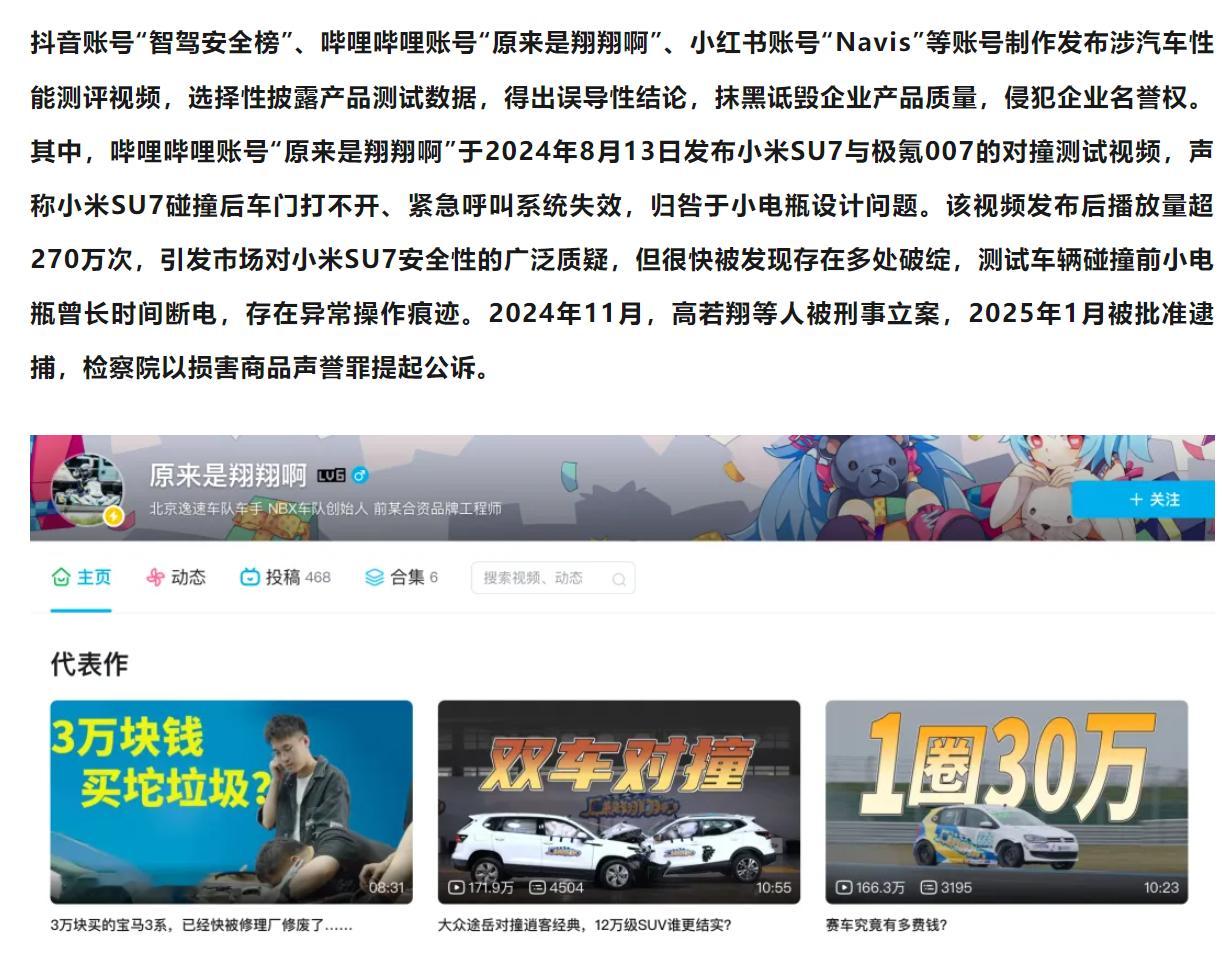 12月11日,据“网信中国”最新通报,小米SU7对撞极氪007的博主 原来是翔翔啊,案例,内容如下:哔哩哔哩账号“原来是翔翔啊”于2024年8月13日发布小米SU7与极氪007的对撞测试视频,声称小米SU7碰撞后车门打不开、紧急呼叫系统失效,归咎于小电瓶设计问题。该视频发布后播放量超270万次,引发市场对小米SU7安全性的广泛质疑,但很快被发现存在多处破绽,测试车辆碰撞前小电瓶曾长时间断电,存在异常操作痕迹。2024年11月,高若翔等人被刑事立案,2025年1月被批准逮捕,检察院以损害商品声誉罪提起公诉。最近真的是在各种严打吵架和黑公关的情况,甚至把之前一些的案例都拿出来大说也说,我国今年汽车销量再次增长但是利润却是下降,甚至出现亏本卖车的情况,这显然是违背国家新能源发展策略的,有这种情况,黑公关也是起到了推波助澜的作用。小米su7与极氪007对撞官方通报原来是翔翔啊