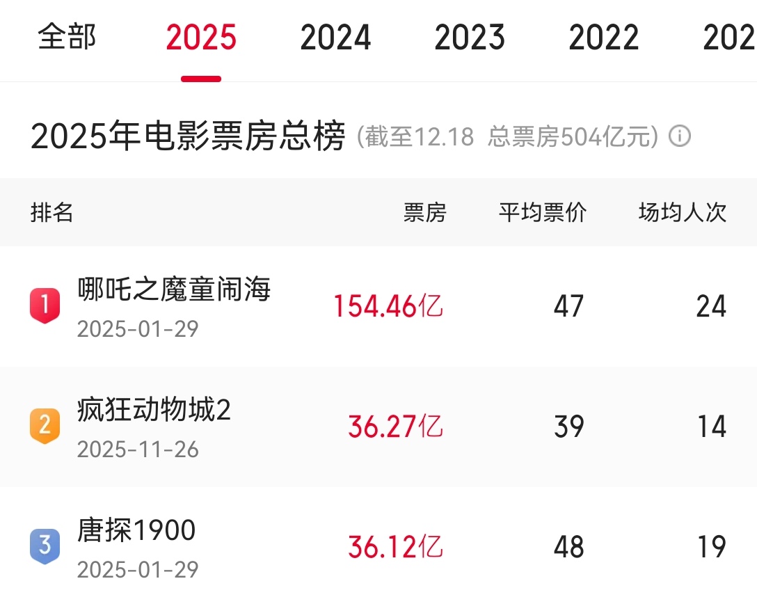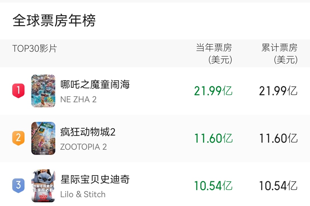 在《阿凡达:火与烬》全面上映之前,2025年中国年度票房冠亚军和全球年度票房冠亚军完全重合,都是:《哪吒之魔童闹海》和《疯狂动物城2》,而且主力观众都是中国影迷。
