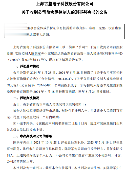 对于公司的影响,古鳌科技表示,陈崇军为公司前任控股股东、前任实际控制人,上述判决为股东个人行为,不会对公司生产经营产生重大不利影响。目前,公司经营情况正常。