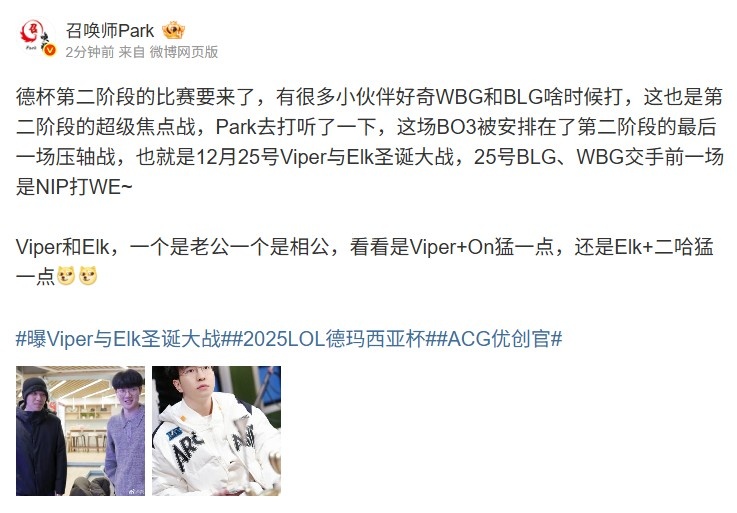 德杯第二阶段的比赛要来了,有很多小伙伴好奇WBG和BLG啥时候打,这也是第二阶段的超级焦点战,Park去打听了一下,这场BO3被安排在了第二阶段的最后一场压轴战,也就是12月25号Viper与Elk圣诞大战,25号BLG、WBG交手前一场是NIP打WE~