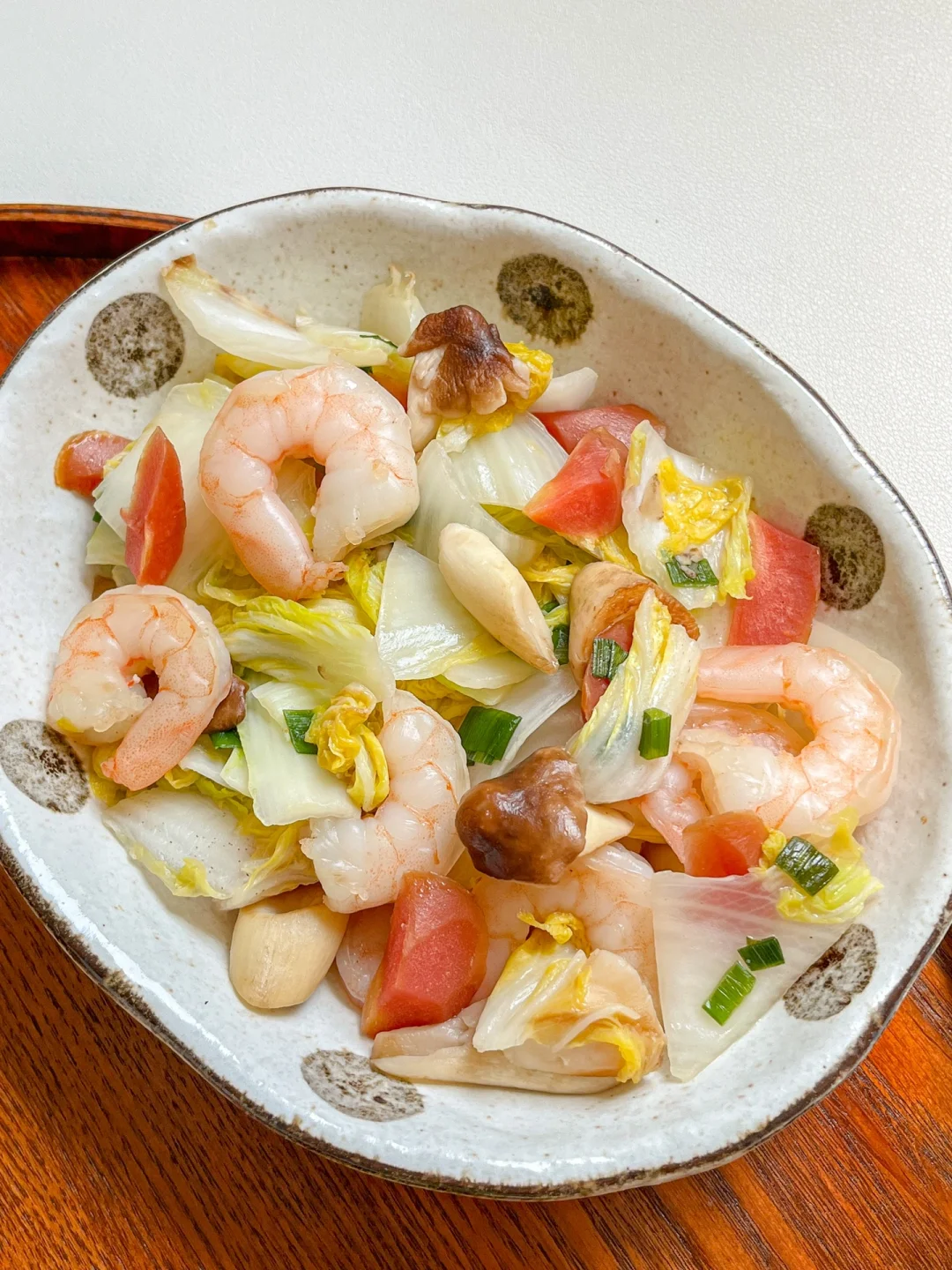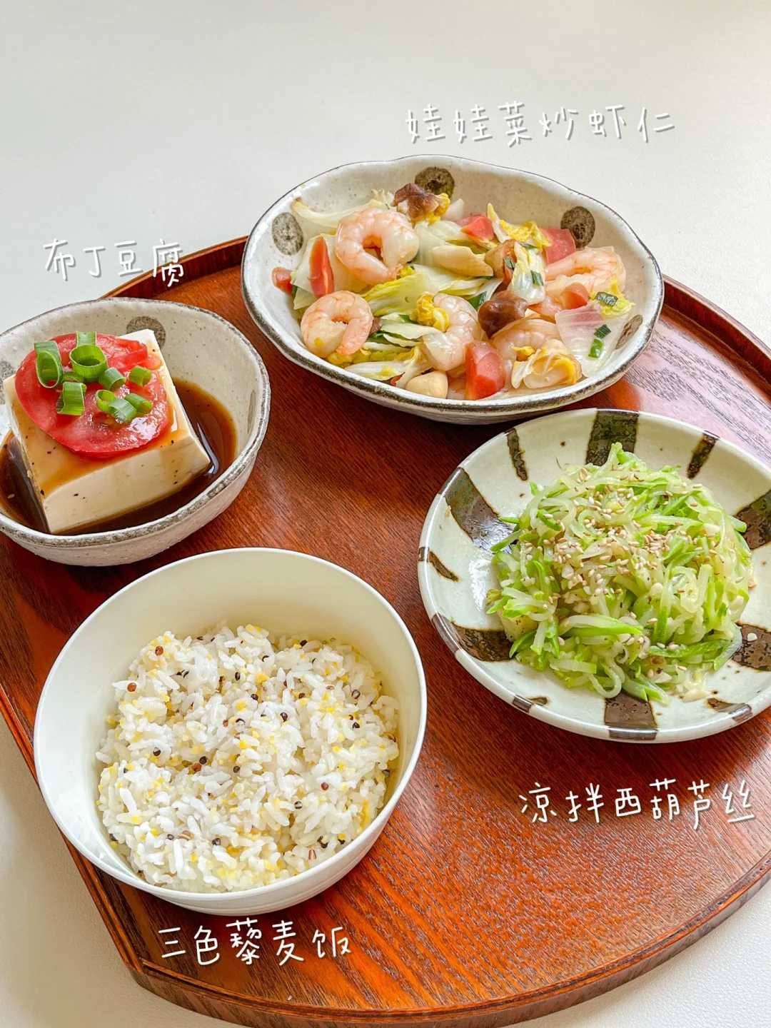 今日午餐: ¹娃娃菜炒虾仁 ²凉拌西葫芦丝 ³布丁豆腐 🟠娃娃菜炒虾仁 这是一道适合夏天减脂期吃的家常菜,加点苹果醋,酸酸的很开胃。用虾现剥或买成品虾仁都行,娃娃菜很容易就炒软了,自带甜味而且纤维感也少。 🟢凉拌西葫芦丝 西葫芦擦成丝,焯水1分钟,加盐、苹果醋、白糖一拌,加一点芥末,再撒点白芝麻,非常棒!听说西葫芦还能生吃,下回试试生拌西葫芦~ 🔴布丁豆腐 夏天最适合吃冰冰凉的布丁豆腐了!放一片西红柿,淋上日式油醋汁就好,简单又清爽的小菜