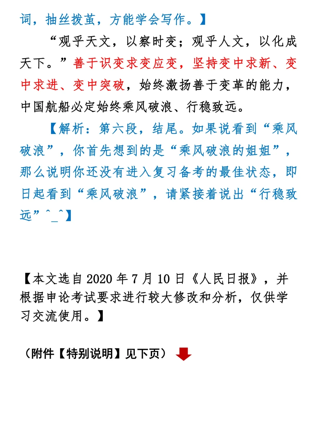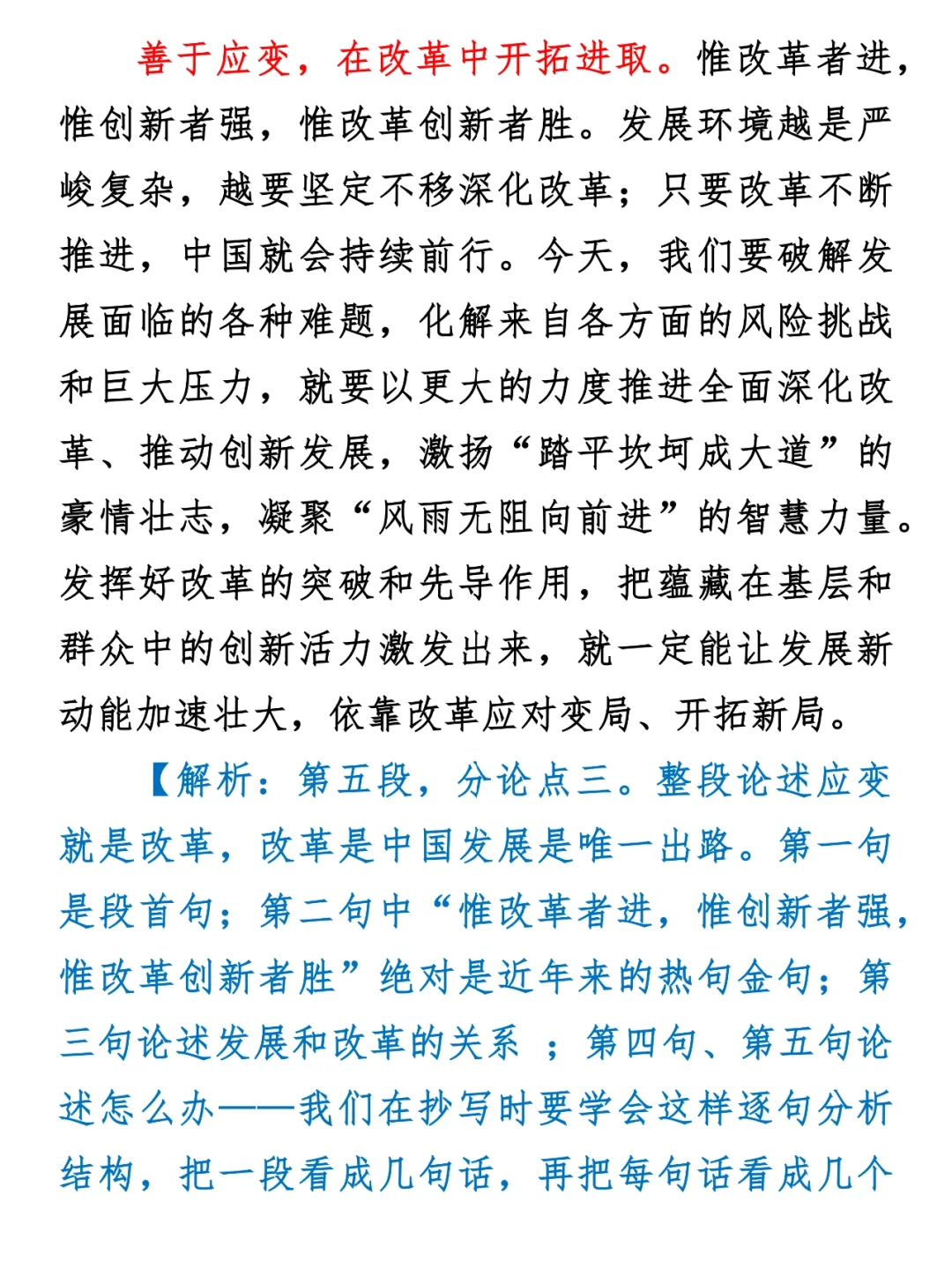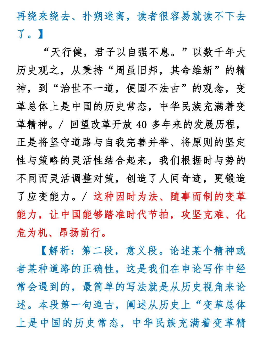 申论的学习是分层的: 第一层是感性认识,我们通过抄写,逐渐熟悉记忆政策理论时政热点内容。 第二层是提炼规律,我们会发现很多共性的规律,比如普遍联系、变化发展、历史的眼光看问题等等。 第三层是实践检验,把所学的感性认识、规律原理等结合在一起,实际演练,内化于心。 大家可以想一想,自己现在处于哪个阶段呢? 那么今天,我们就用一篇申论范文学一个“规律性”的内容——“变化”。